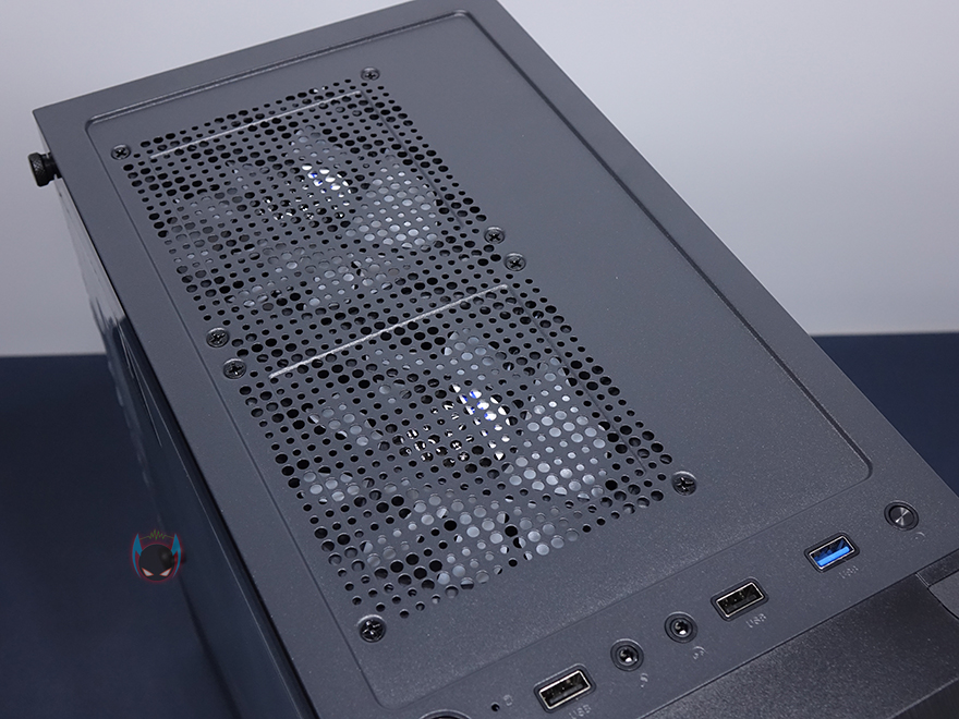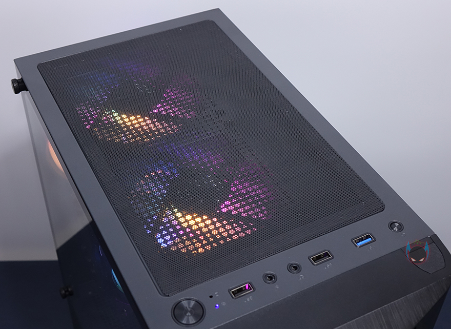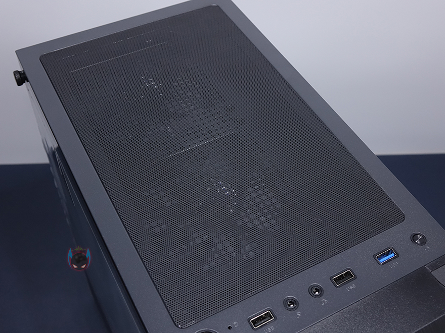 잘만 N4 i40 강화유리 PC케이스 외형부터 살펴보면, 전면베젤은 테두리 부분을 제외한 나머지 부분을 메쉬(타공망) 디자인으로 처리해놨으며, 앞서 기본사양 표기에서 확인했듯이, 외부에서 내부 140mm 팬이 3개 장착되었다라는 것도 미리 간접적으로 볼 수 있습니다. 물론, 시작에서 언급한대로 이 3개의 팬들은 모두 RGB 팬이죠. 그리고, 베젤 측면에도 외부 공기가 어느정도 유입되도록 홀 처리를 해놨습니다. 케이스 상단은 앞자리에 버튼과 포트 배치로 왼쪽부터 전원버튼, USB 2.0, MIC/EAR, USB 2.0, USB 3.0, 리셋 버튼 순으로 배치되어 있으며, 그 뒤로는 자석방식의 먼지 필터가 부착되어 있는데, 필터를 분리하면 상단 쿨링효과를 위해 에어홀 처리가 적용된 것을 확인할 수 있고, 앞에서 언급대로 내부에 120mm 팬이 기본 2개 장착되었다라는 것도 미리 확인할 수 있습니다. 물론, 이 팬들 역시 RGB 팬이죠.