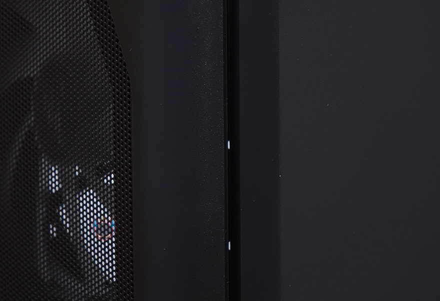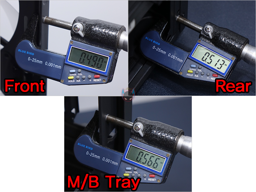 내부 끝으로, 전면 베젤을 분리해 전면 내부를 보면, 앞서 외부에서 언급한 140mm RGB 팬이 3개 기본 장착된 것을 확인할 수 있습니다. 120mm 팬과 마찬가지로 9개의 블레이드(날개)를 가진 팬이며, 연결방식은 P-ATA 방식입니다. 참고로, 앞서 상단과 후면에 장착된 120mm 팬은 1100PRM(±10%), 140mm 팬은 900(±10%) 속도로 작동됩니다. 그리고, 마지막으로 N4 i40 케이스 제작에 사용된 샤시의 두께를 측정할 수 있는 부위별로 측정한 결과 0.5mm대 샤시가 주로 사용되었다라는 것을 짐작할 수 있습니다.