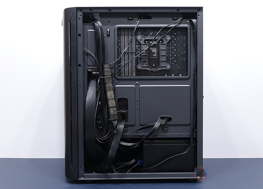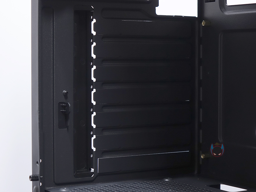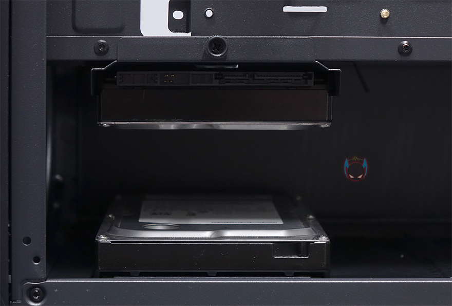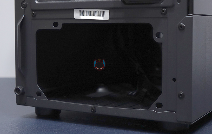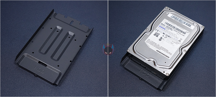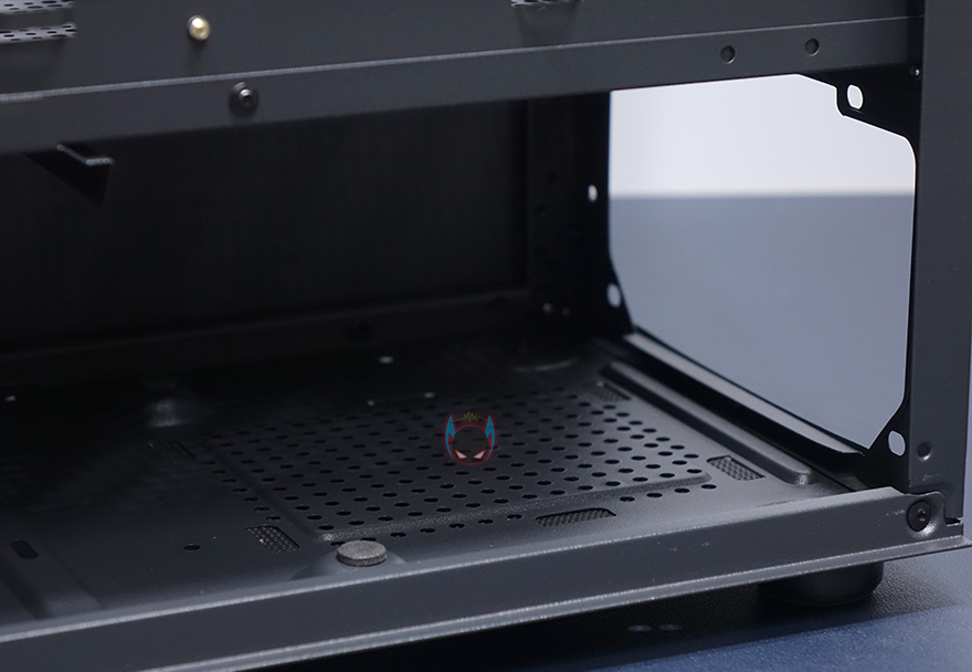내부 하단은 요즘 PC케이스 트랜드처럼 커버를 적용해놨는데, 커버 상단에 에어홀 처리와 함께 추가로 120mm 팬을 2개 더 장착할 수 있게 나사홀까지 적용되어 있습니다. 그리고, 안쪽으로 역시 케이블 정리를 위해 선정리홀도 일부 적용되어 있죠. 커버가 적용되었기 때문에, 파워서플라이는 반대편인 오른쪽에서 장착할 수 있는데, 기본 받침대와 고무 패드가 부착된 것을 확인할 수 있죠. 그리고, 앞자리에는 저장장치를 장착할 수 있는 위치로 윗부분에 핸드스크류로 베이를 장착하고 있는데, 핸드스크류를 풀면 쉽게 분리되는 베이는 3.5인치 HDD나 2.5인치 HDD/SSD를 1개 장착할 수 있습니다. 그리고, 앞서 외부 케이스 밑바닥부분에서 언급했듯이, 내부 밑바닥부분에도 HDD/SSD 1개를 장착할 수 있죠. 물론, 내부 구성에 따라서 사용하지 않아도 됩니다. 물론, 사용하지 않으면 그만큼 케이블 정리공간이 많이 확보는거죠.