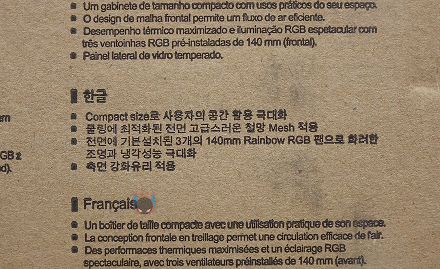 제품박스는 심플하게 전후면은 동일한 디자인으로 제품 이미지와 모델명, 그리고 강화유리가 장착되었다는 표기와 함께 제품의 주요 특징을 4가지 정도 언급하고 있는데, 바로 한쪽 측면에 한국어를 포함한 각 나라별 언어로도 표기를 해놔서 쉽게 이해할 수 있습니다. 그리고, 반대쪽 측면에는 제품의 기본 사양을 표기해놨는데, 요즘은 그래픽카드 길이, CPU쿨러 높이, 파워 깊이 길이까지 표기해주는 것은 기본이 되었죠. 이 제품 역시 부품 장착 길이에 대한 표기를 모두 해놨기 때문에 구입 전에 간섭여부를 어느정도 파악할 수 있습니다. 그리고, 좀 더 관심있게 보면 눈에 띄는 부분이 하나있죠. 바로, 전면에 장착된 팬이 3개인데, 140mm 팬이라는 점입니다. 일반적으로 120mm 팬을 3개 제공해주는 경우가 많은데, 이 제품은 이보다 더 큰 140mm 팬을 3개 제공해준다라는 거죠. 그리고, 케이스 포장은 기본방식인 비닐포장과 스티로폼 방식으로 외부 충격방지가 되도록 해놨으며, 부속품은 지퍼-백에 담아서 분실이 되지 않도록 했죠. 케이스를 제외한 부속품은 간단하게 제품설명서, 부품 장착에 필요한 스크류, 케이블타이 제공으로 이루어져 있습니다.