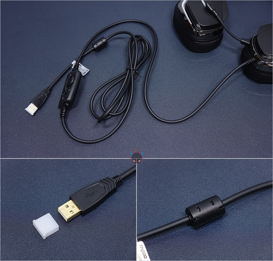 케이블 길이는 총 2.3m 정도이며, 연결인터페이스 방식은 USB 방식으로 금도금처리를 함께 적용해 신호손실이 최소화 되도록 했는데, 케이블에도 노이즈필터까지 적용되어 있죠. 사용하지 않을 시에는 USB 포트 부식방지를 위해 마개도 함께 제공해주고 있습니다. 그리고, 케이블에 유선 리모컨이 탑재되어 있는데, VH610 모델과 마찬가지로 리모컨으로는 볼륨조절과 마이크 On/Off, RGB 라이팅 On/Off 기능을 컨트롤할 수 있습니다.