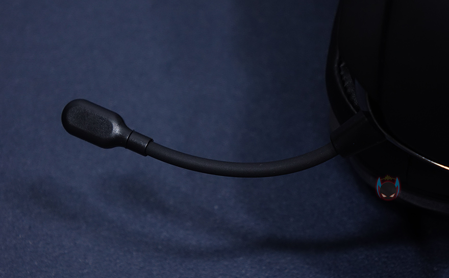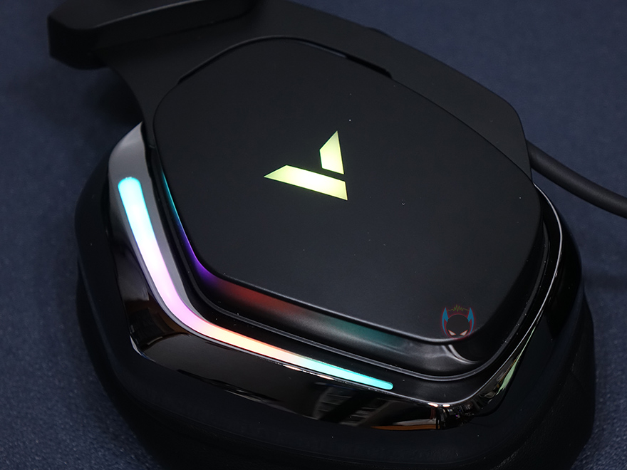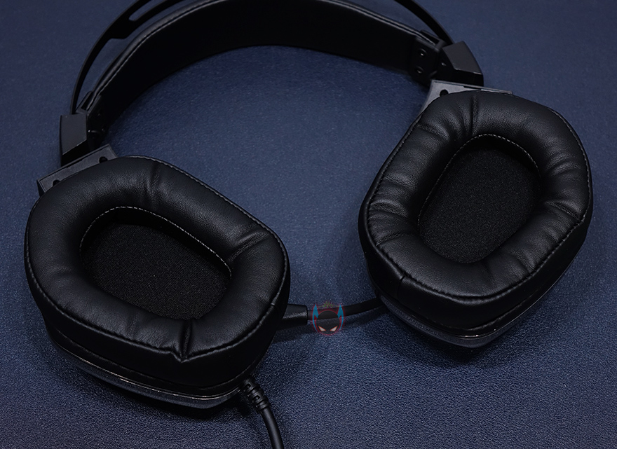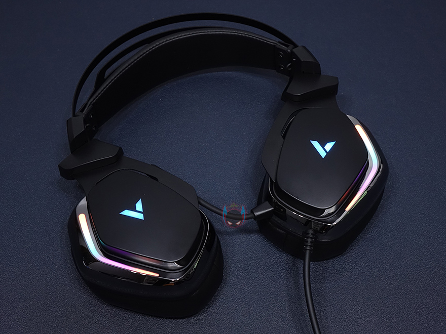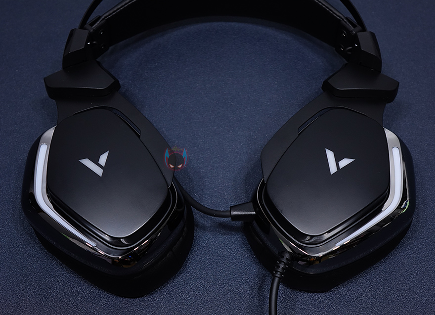 밴드와 이어-컵이 연결되는 부위는 90도까지 회전이 가능하며, 이어-컵부분을 살펴보면 외부쪽은 Rapoo의 게이밍 로고 V 표기와 주변 테두리에 크롬 맥기를 처리했는데, 로고와 맥기 일부분에 RGB 라이팅효과를 볼 수 있도록 해놨습니다. 이부분은 사용시 바로 확인이 됩니다. 그리고, 왼쪽 이어-컵부분에는 마이크가 탑재되어 있는데, 분리형은 아닙니다. 마이크 전체 길이는 약 10cm입니다. 그리고, 안쪽 이어-패드부분은 귀를 완전히 덮어주는 밀폐형이며, 편안한 착용감을 위해 인조가죽에 쿠션형태로 적용했죠. 또한, 내부에는 이미 사양표기에서 확인했듯이 50mm 드라이버 유닛을 탑재하고 있습니다.