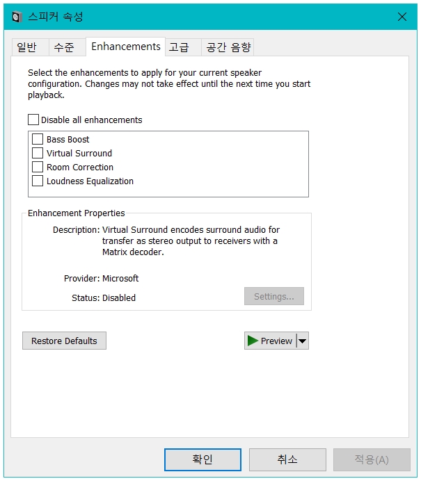 실제로 Rapoo VH710 게이밍헤드셋 제품을 사용해보면, PC와 연결해서 인식이 되면 바로 이어-컵부분에 RGB 라이팅효과를 볼 수 있는데, 추가적인 모드 지원은 없고, 기본작동으로 RGB 라이팅효과를 보여줍니다. 이건, VH610일때도 동일했죠. 그리고, 착용감은 귀를 완전히 덮어줘서 밀폐느낌은 있는데, 앞서 확인했듯이 이어-컵이 회전만 가능하기 때문에 바로 한 번에 착용되기보다는 착용 후 좀 더 귀에 밀착시키도록 회전을 약간 조절해줘야 합니다. 사운드체감은 가격대를 생각하면 나쁘지 않습니다. 50mm 유닛 크기와 32Ω 임피던스 기준에서 보면 볼륨 100% 상태임에도 날카롭지 않기때문에 청각에 피로감이 적습니다. 다만, 바로 하위모델인 VH610에선 소프트웨어가 제공되었는데, VH710에선 소프트웨어 지원이 없기 때문에 윈도우 운영체제 제어판-스피커 속성에서 가상 서라운드 등의 사운드효과를 사용해야하는데, 베이스 부스트를 사용하면 사운드 진동은 좀 더 강해지는 한 편 음성적인부분이 감소하고, 가상 서라운드 역시 베이스 부스트와 큰 차이가 없어서 체감이 좀 아쉽습니다. 개인적으로는 가장 기본설정상태로 사용했을 때가 가장 좋다라는 느낌을 받았습니다.