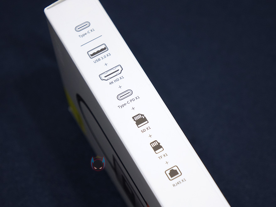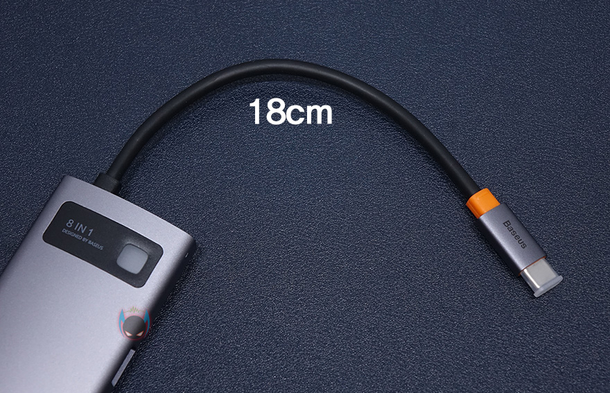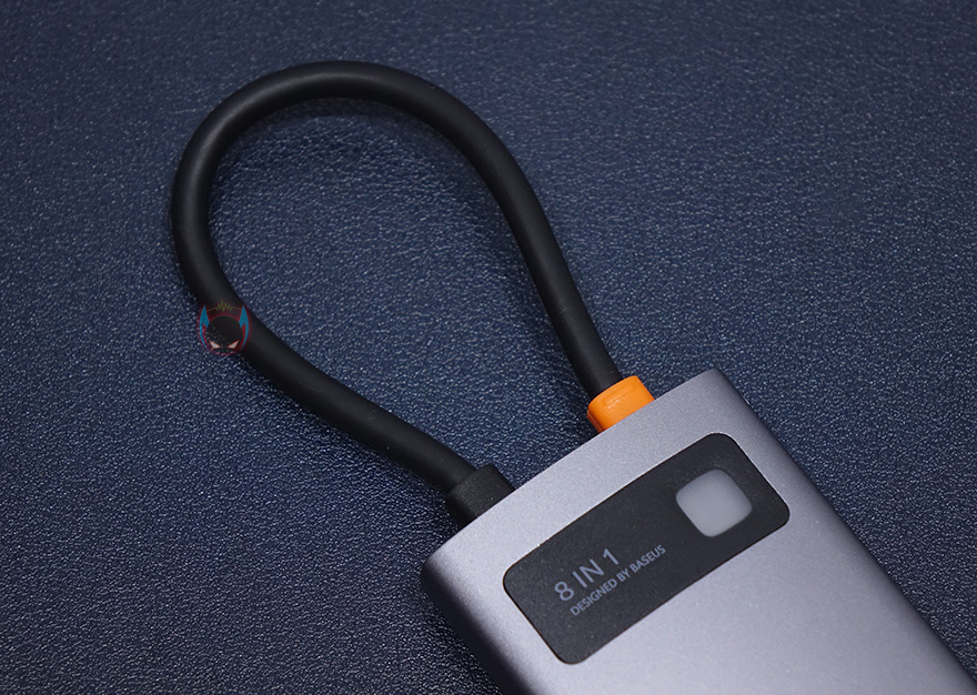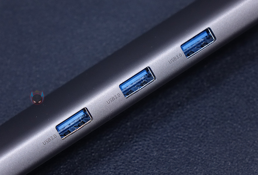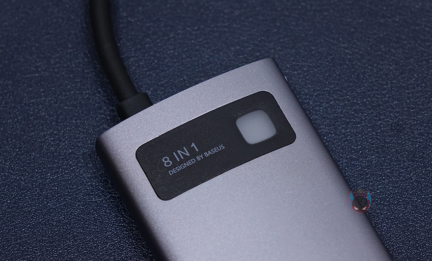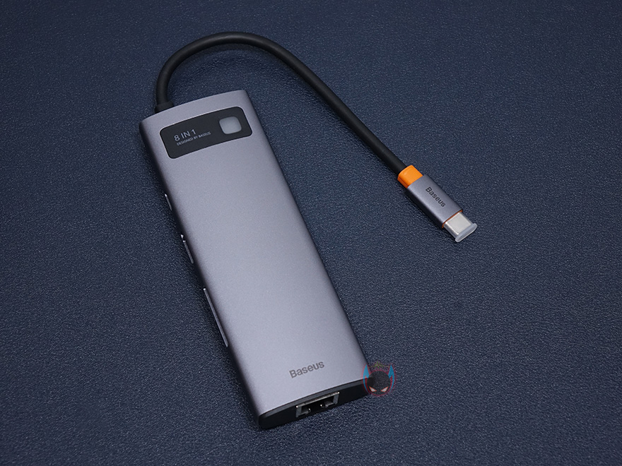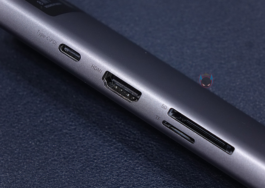 본체를 좀 더 살펴보면, 케이스 재질을 알루미늄 합금으로 보통 액세서리 제품에 이런 재질을 사용하면 기본적으로 고급스러운 느낌이 나죠. 그리고, 윗부분에는 8-in-1 표기와 함께 오른쪽에 연결상태를 보여주는 LED 램프가 적용되어 있습니다. 참고로, 뒤에서 확인하겠지만, 작동시 램프 색상은 블루입니다. 그리고, 왼쪽 측면에는 기본으로 갖추는 USB Type-C 포트와 HDMI 포트 외에 SD카드와 TF카드 슬롯이 8-in-1 제품에 추가로 있으며, 반대쪽 측면에는 USB 3.0 포트가 총 3개 적용되어 있습니다. 참고로, USB Type-C 포트는 충전 겸용으로 PD 100W까지 지원하며, HDMI 포트는 4K 해상도까지 지원합니다. 그리고, SD와 TF카드슬롯은 최대 60MB/s 전송속도를 지원하고, USB 3.0 포트도 최대 500MB/s 전송속도를 지원하죠. 물론, USB 3.0 포트도 5V/1.5A의 충전 지원을 합니다. 그리고, 본체 아랫부분에는 RJ-45 랜 포트가 적용되어 있는데, 1,000ㅡbps까지 지원하죠.