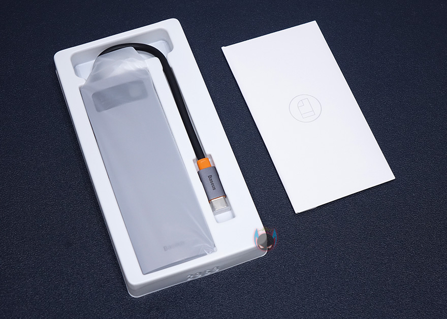 박스를 열어보면, 메탈 글림 USB 허브는 비닐 포장과 함께 흔들리지 않게 틀-포장재를 사용해 포장되어 있으며, 별도의 속박스에는 제품 설명서, 보증서, 스티커를 담고 있습니다. 설명서를 제외하면 보증서와 스티커는 베이스어스 제품에서 늘 보는 구성품이죠.