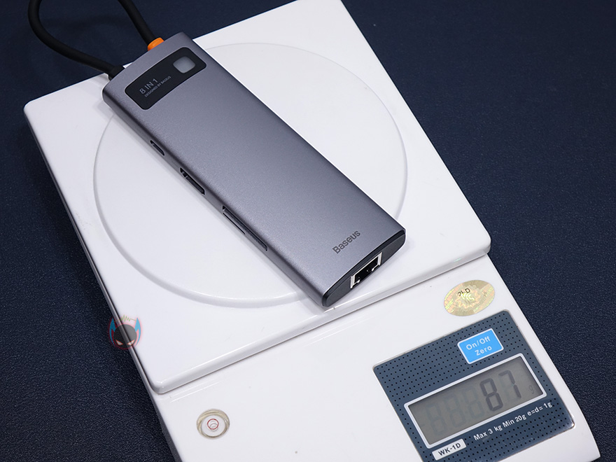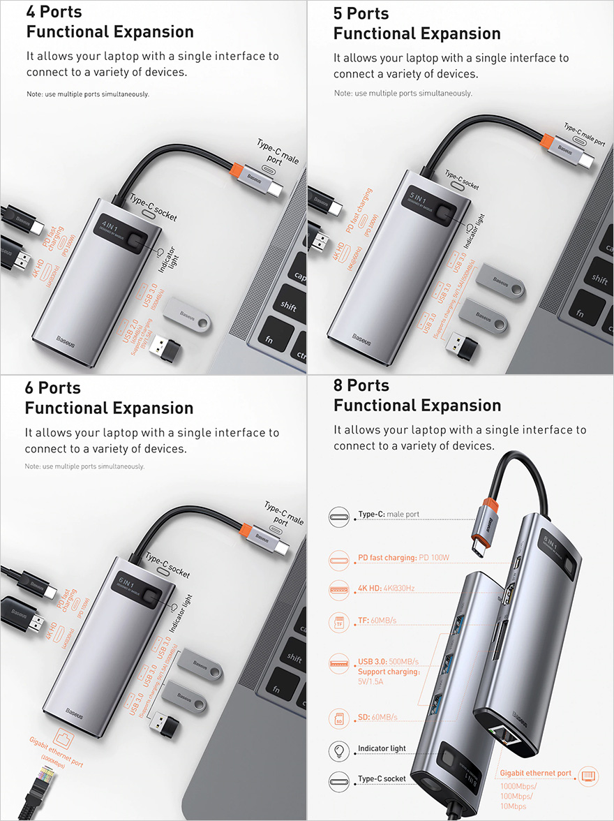 그럼, 베이스어스(Baseus)의 메탈 글림(Metal Gleam) 시리즈 USB 허브를 살펴보는데, 앞서 언급했듯이, 메탈 글림 시리즈는 다기능 Type-C USB 허브 제품으로 4-in-1, 5-in-1, 6-in-1, 8-in-1 총 4가지 모델이 있습니다. 물론, 포트 차이에 따라서, 길이 차이도 있습니다. 그리고, 기본적으로 USB Type-C 포트 1개와 HDMI 포트 1개, USB 3.0 포트 2개를 시작으로 포트들이 추가되는 차이는 두고 있죠. 가장 많은 포트를 가진 8-in-1 모델 같은경우 허브 본체 길이는 131.5mm, 폭은 44.5mm, 높이 16.5mm로 슬림한 사이즈이기 때문에 주머니에 넣고 다닐 정도로 휴대성으로는 최적이라 할 수 있습니다. 무게도 87g 밖에 되지 않죠.