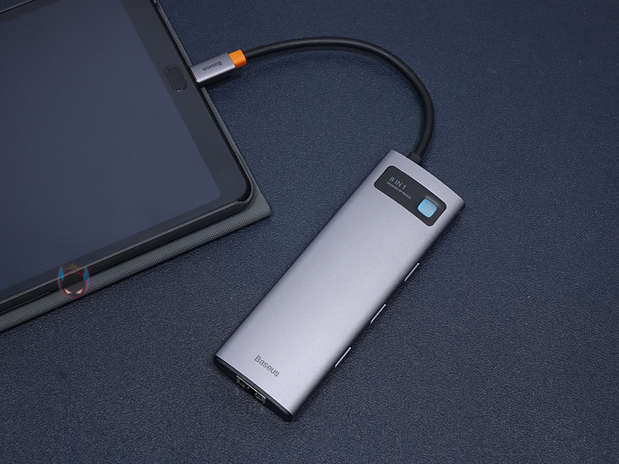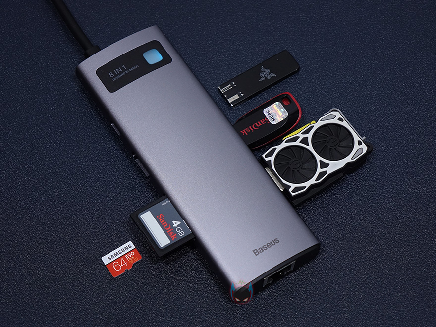 그럼, 실제로 베이스어스 메탈 글림 시리즈 USB 허브를 사용해봐야겠죠. 노트북이나 모바일기기에 있는 USB Type-C 포트에 허브를 연결하면 바로 사용이 가능합니다. 블루색상의 LED 램프로 작동상태를 바로 알 수 있죠. USB 포트와 카드리더기가 있기 때문에, 기본적으로는 일반적인 USB 메모리 허브 역할을 합니다. 물론, 외장HDD/SSD 같은 제품들도 연결해서 사용할 수 있죠. 또한, 만약 노트북에 랜 포트 지원이 USB 어댑터 방식으로 지원한다면, 이 베이스어스 메탈 글림으로 교체하면 랜 포트 어댑터 역할뿐만 아니라 방금 언급한 USB 메모리 허브와 카드리더기까지 확장으로 사용할 수 있어서, 이 제품이 나온 가장 최적의 요건이라고 할 수 있습니다.