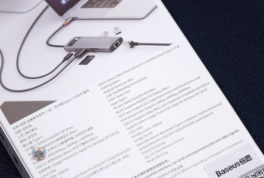 제품팩키지 형태는 박스형태로 전면에 제품 이미지와 함께 메탈 글림(Metal Gleam) 시리즈라는 문구를 확인할 수 있습니다. 참고로, 이 메탈 글림 시리즈 USB 허브는 4-in-1부터 8-in-1까지 총 4가지 모델로 나왔습니다. 이부분은 뒤에서 다시 한 번 언급하기로 하고, 필자가 접한 모델은 최대인 8-in-1 모델인데, 모델명과 함께 박스 한쪽 측면에 어떤 포트들이 갖추고 있는지 미리 확인할 수 있습니다. 그리고, 반대쪽 측면에는 갖추고 있는 포트들로 지원되는 기능들을 표기하고 있죠. 박스 후면에도 제품 연출 이미지와 함께 제품의 기본 사양을 자세히 표기해놨기 때문에, 액세서리 제품군으로 구입하기전 충분히 정보를 얻을 수 있겠습니다.