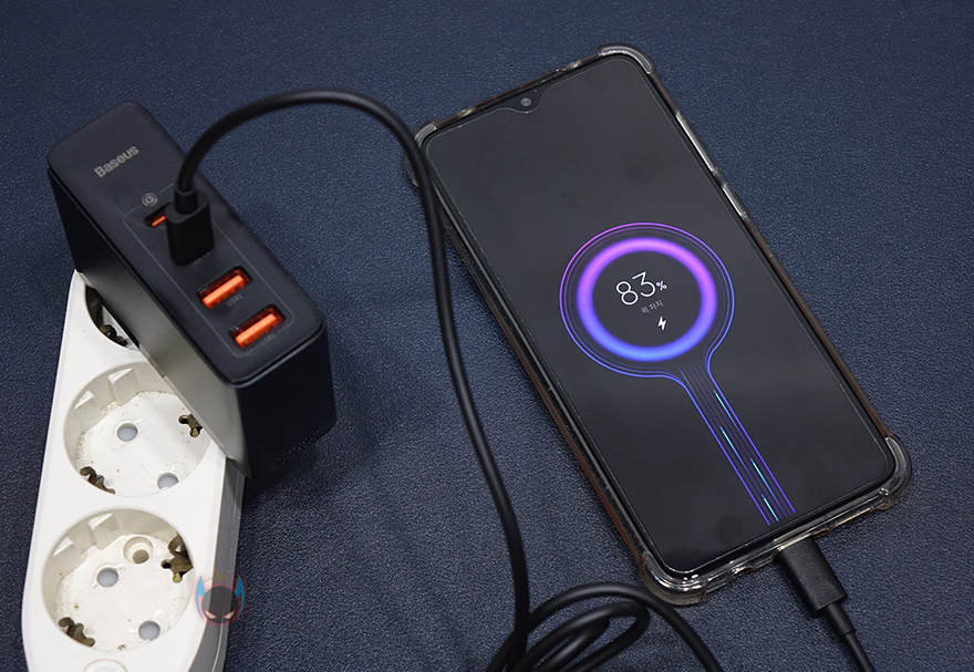 실제로 베이스어스(Baseus) GaN2 프로 고속충전기를 사용해보면, 일단 포트 하나만 사용해도 고속충전이 작동되는 것을 확인할 수 있는데, 앞서 언급했듯이 최소 15W부터 지원하기 때문에, 10W나 5W 충전의 기기를 연결하면 안됩니다. 그리고, 2개의 이상의 기기를 연결해서 충전할 때도 고속충전이 진행되는 것을 볼 수 있는데, 앞서 충전 표기에서 확인했듯이 각 포트별로 분산되어 고속충전이 되는 방식입니다. 물론, 이런 방식으로 사용했을 때도 USB Type-C 포트는 최대 65W까지 지원한다고 언급했는데, 실제로 스마트폰과 보조배터리 2개를 연결 이 중 보조배터리 1개는 최대 65W 충전지원을 하는데, 3개가 연결된 상태에서 확인해 본 결과 55~60W로 충전되는 것을 확인할 수 있었고, 실제로 65W 지원의 20,000mAh 보조배터리 1시간 가량 충전했을 때 60W가량 충전되는 것을 확인할 수 있었습니다. 그리고, 충전기 사용시 LED 램프는 블루 색상입니다.