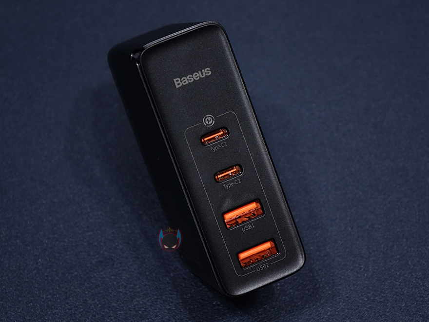 앞서 언급했듯이 포트는 총 4개를 갖추고 있는데, USB Type-C 포트 2개, Type-A 포트 2개로 2C+2U 구성입니다. 그리고, 포트 안쪽 색상들은 모두 오렌지 색상으로 눈에 잘 띄도록 해놨으며, Type-C 포트는 어느쪽을 사용하더라도 1개만 사용했을 때는 100W까지 지원하고, Type-A 포트는 1개를 사용했을 시 65W까지 충전지원합니다. 그리고, 사용시 작동 상태를 알 수 있게 전원 LED 램프도 모서리부분에 적용해놨고, 플러그 방향쪽으로 어댑터표면에는 다시 한 번 포트별 충전 전력량을 표기해놨기 때문에, 여러 개의 기기를 충전하기 전 한 번씩 보면 도움이 되겠습니다.
