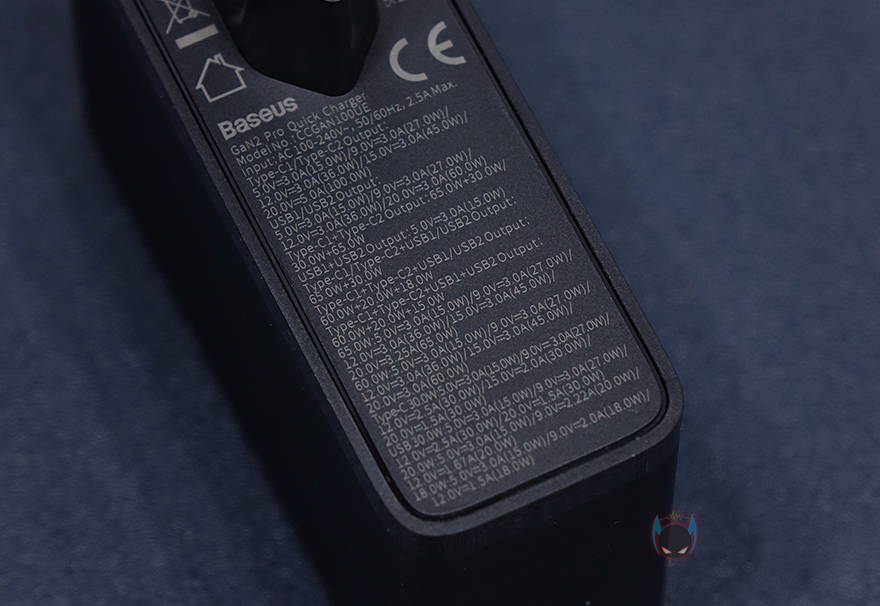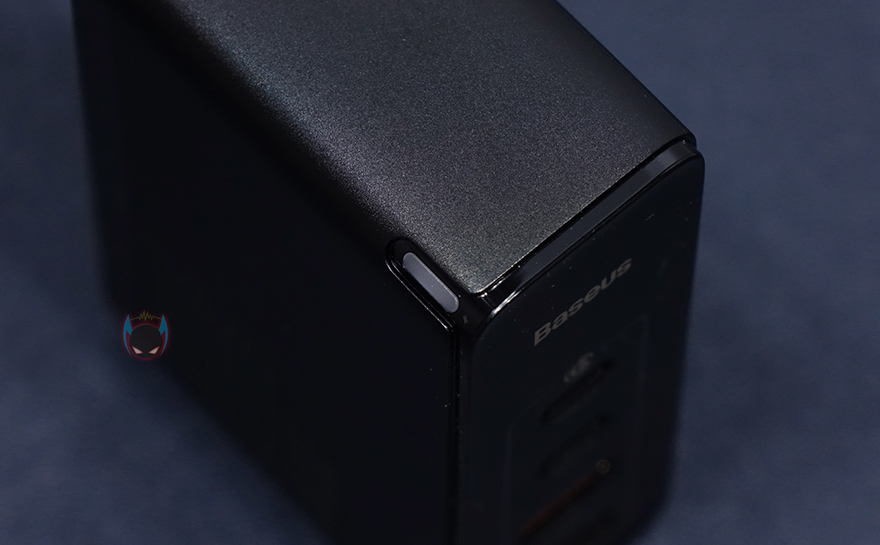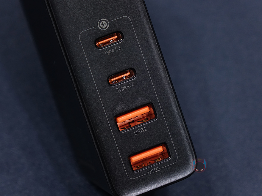 앞서 언급했듯이 포트는 총 4개를 갖추고 있는데, USB Type-C 포트 2개, Type-A 포트 2개로 2C+2U 구성입니다. 그리고, 포트 안쪽 색상들은 모두 오렌지 색상으로 눈에 잘 띄도록 해놨으며, Type-C 포트는 어느쪽을 사용하더라도 1개만 사용했을 때는 100W까지 지원하고, Type-A 포트는 1개를 사용했을 시 65W까지 충전지원합니다. 그리고, 사용시 작동 상태를 알 수 있게 전원 LED 램프도 모서리부분에 적용해놨고, 플러그 방향쪽으로 어댑터표면에는 다시 한 번 포트별 충전 전력량을 표기해놨기 때문에, 여러 개의 기기를 충전하기 전 한 번씩 보면 도움이 되겠습니다.