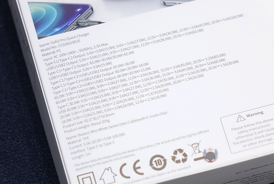 박스 후면에는 베이스어스(Baseus) GaN2 프로 고속충전기가 주로 어떻게 활용되는지 알 수 있는 연출 이미지와 함께 아래에 제품 기본 사양과 함께 포트 조합별로 고속충전 전력량을 표기해놨는데, 상당히 많이 표기되어 있어서 복잡한 것 같지만, 간단히 정리하자면, 최소 15W~최대 100W까지 지원하고, 당연히 USB Type-C 포트로 사용했을 시에 최대 100W를 지원하며, 1개를 사용했을 때 100W 입니다. 2개이상의 포트를 사용할 때부터는 최대 65W를 지원하고, 나머지 전력량으로 고속충전을 지원하는거죠. 유의할점은 최소 15W부터 지원하기 때문에 5W와 10W 제품을 연결해서 충전하면 안됩니다. 그리고, 제품 구성은 충전어탭터와 케이블, 제품설명서, 보증서, 스티커로 구성되어 있는데, 어댑터는 비닐포장, 충전케이블은 속박스 포장으로 USB Type-C to C 케이블입니다. 길이는 1m.