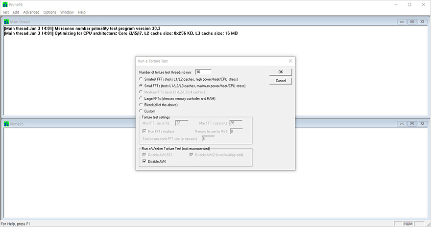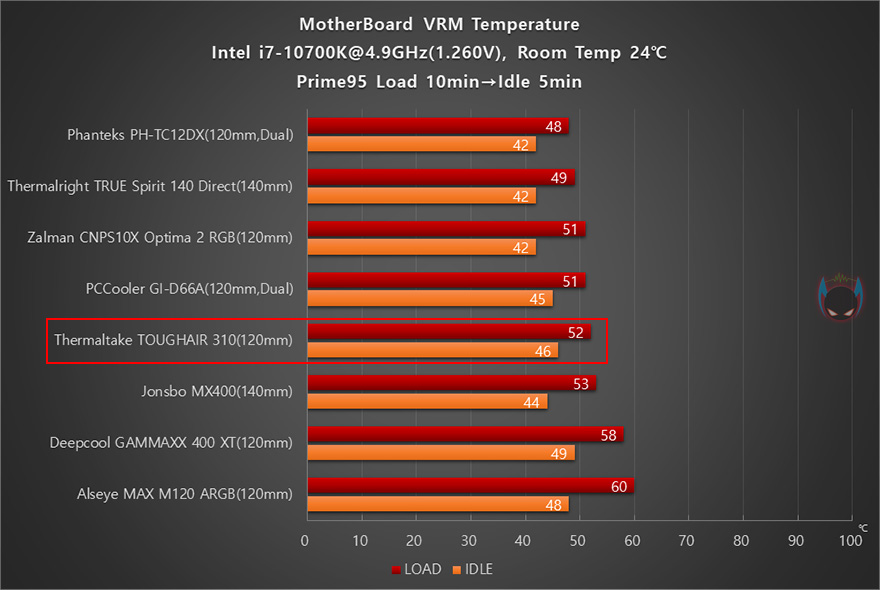 이제, 써멀테이크 TOUGHAIR 310 CPU쿨러의 냉각성능 확인해보는데, CPU는 인텔 i7-10700K이며, B560 메인보드에선 전력해제로 올-코어(All-Core) 4.7GHz까지 기본적으로 작동되기 때문에, Z590 메인보드로 한 단계 높은 4.8GHz로 오버클럭을 했으며, Prime95 프로그램을 통해 Load 10분 과부하 후, 5분간 Idle로 전환하는 방식으로 진행했습니다. 또한, 최대한 팬 소음 측정을 위해 파워서플라이는 팬리스(Fanless) 제품으로 사용되었고, 팬은 기본적으로 메인보드에 바로 연결해 PWM방식으로 작동합니다.