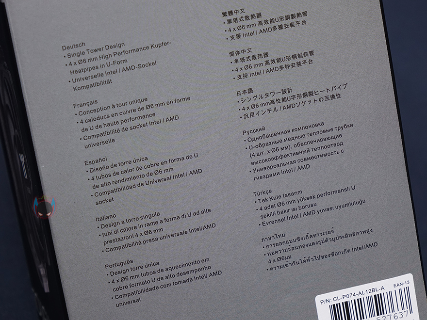 제품박스는 비교적 작은 편이며, 박스 전면에 제품 이미지를 담고 있기 때문에 개봉 전에 미리 쿨러 디자인을 볼 수 있습니다. 그리고, 모델명과 함께 팬 속도, 소음, TDP 170W 표기를 추가로 확인할 수 있는데, 박스 측면에 더 상세하게 제품 사양을 표기해놨기 때문에, 구입 전에 충분한 정보를 얻을 수 있겠습니다. 그리고, 반대쪽 측면에는 각 나라별 언어로 주요 특징을 표기해놨는데, 한국어는 포함되어 있지않고, 박스 후면에 이미지와 함께 다시 한 번 주요 특징을 확인할 수 있습니다.