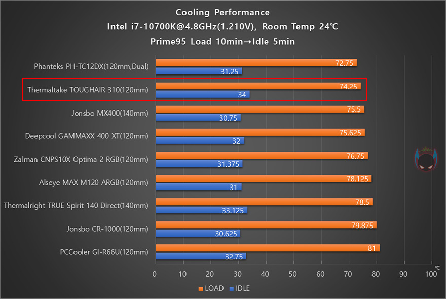 먼저, CPU온도를 확인해보면 Load 상황에선 약 74.25℃, Idle 상황에선 약 34℃ 온도를 보여줬는데, 전체 비교 쿨러들 중에서 상위권의 냉각성능인 것을 확인할 수 있습니다. 또한, 듀얼 팬 쿨러를 제외하면 사실상 가장 좋은 성능인 것을 확인할 수 있죠. 그리고, 메인보드 전원부에 냉각영향 효과도 확인해보면, Load에선 약 48℃, Idle에선 약 45℃로, 전체 비교 쿨러들 중에서 중간정도 위치로 준수하게 메인보드 전원부에도 냉각효과를 주는 것을 확인할 수 있습니다.