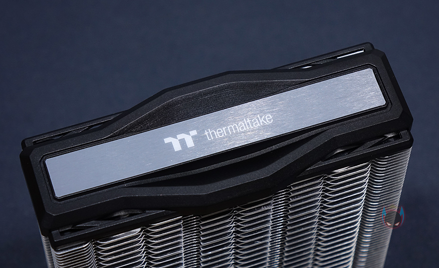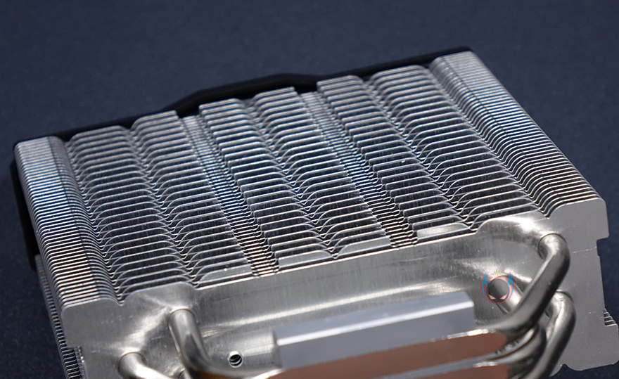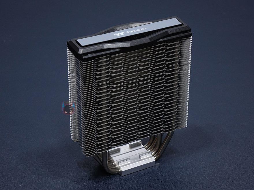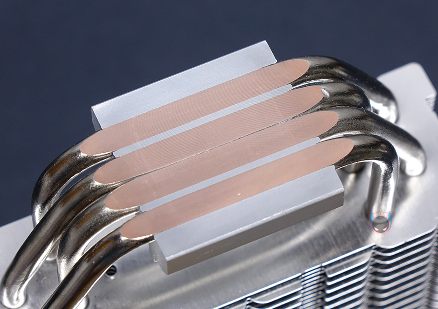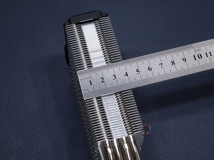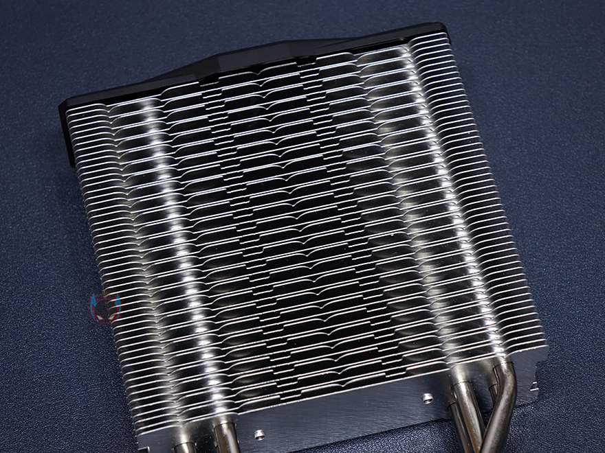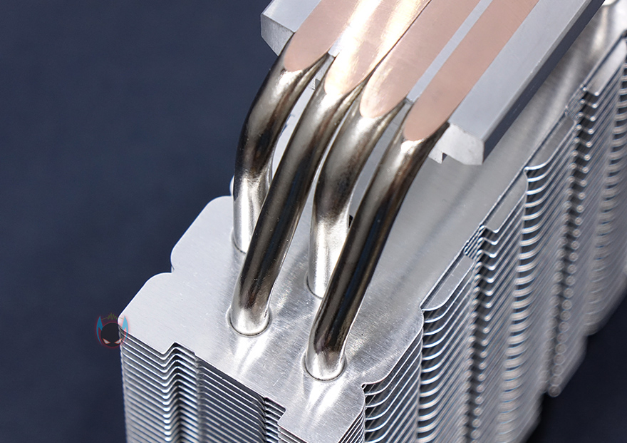 방열핀은 총 52개가 사용되었으면, 비스듬하게 보면 번갈아가면서 서로 다른 디자인의 방열핀을 적용해 물결형태로 나타낸 것을 확인할 수 있으며, 히트파이프와 연결방식은 관통식이고, 방열핀 맨 상단부분에는 로고와 함께 별도의 커버를 장착하고 있습니다. 보통 이런 커버들은 나사방식으로 장착되어 있기때문에, 커버를 분리할려면, 로고부분을 떼어내야하겠습니다. 히트파이프는 지름 6mm로 총 4개가 사용되었고, CPU와 맞닿는 베이스부분은 히트파이프가 바로 접촉하는 일명 DTH(Direct Touch Heatpipe)방식이 되겠습니다.