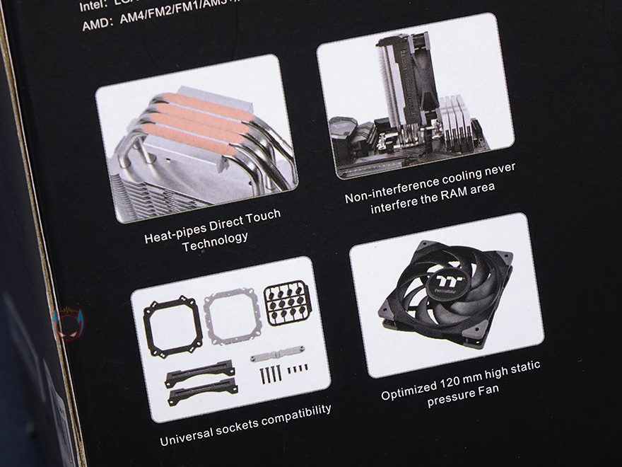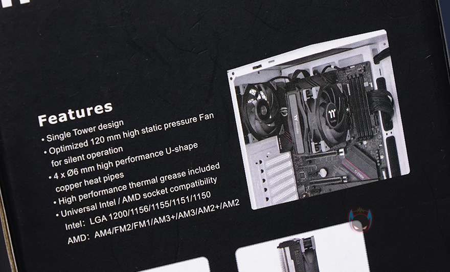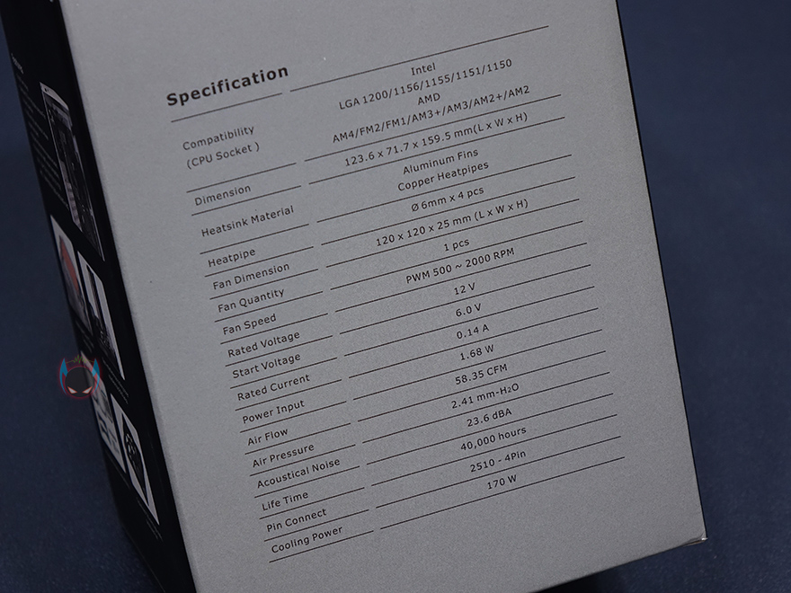 제품박스는 비교적 작은 편이며, 박스 전면에 제품 이미지를 담고 있기 때문에 개봉 전에 미리 쿨러 디자인을 볼 수 있습니다. 그리고, 모델명과 함께 팬 속도, 소음, TDP 170W 표기를 추가로 확인할 수 있는데, 박스 측면에 더 상세하게 제품 사양을 표기해놨기 때문에, 구입 전에 충분한 정보를 얻을 수 있겠습니다. 그리고, 반대쪽 측면에는 각 나라별 언어로 주요 특징을 표기해놨는데, 한국어는 포함되어 있지않고, 박스 후면에 이미지와 함께 다시 한 번 주요 특징을 확인할 수 있습니다.