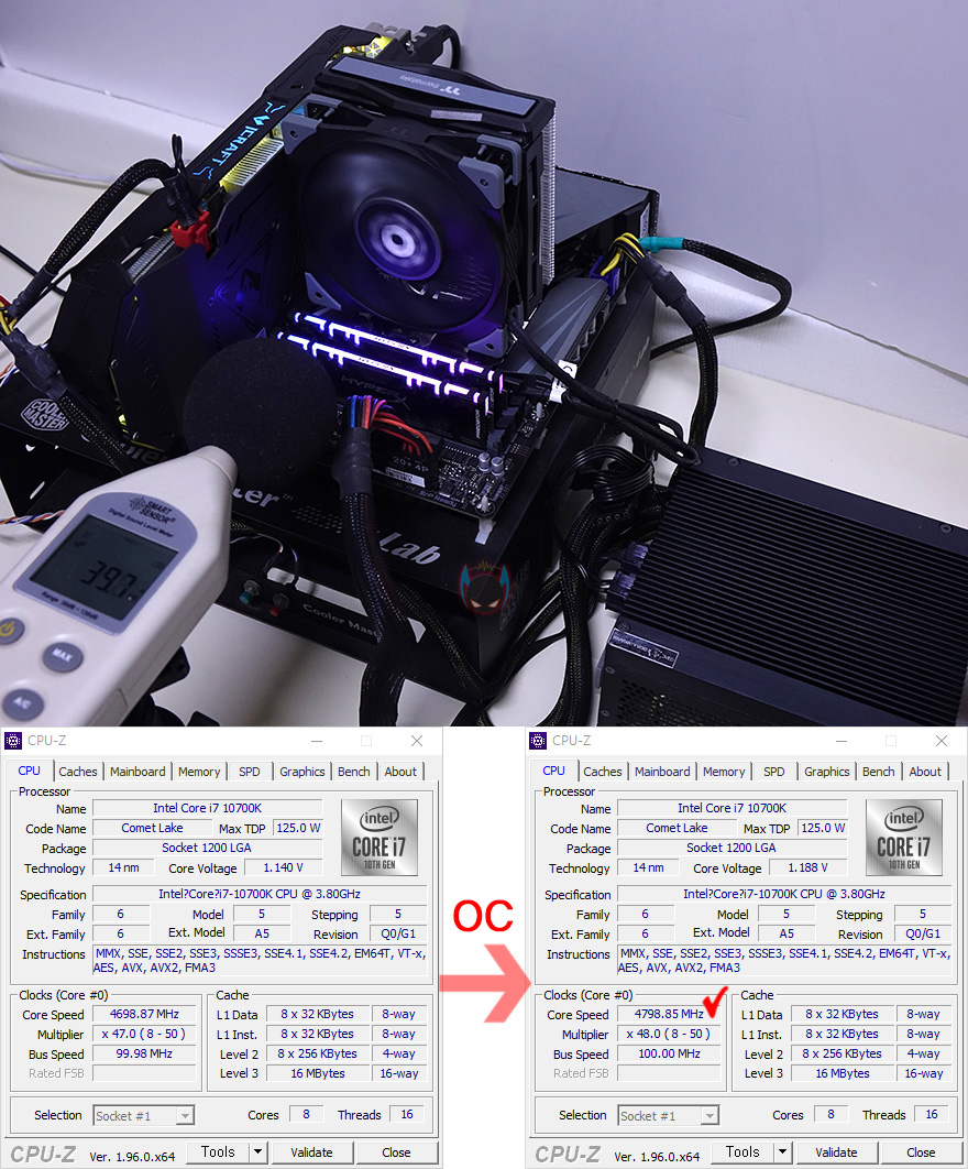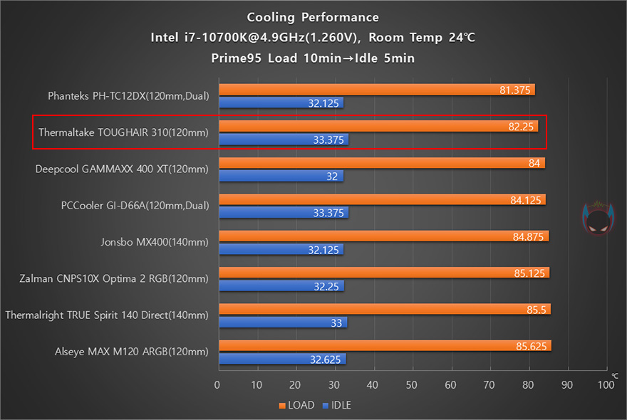 이제, 써멀테이크 TOUGHAIR 310 CPU쿨러의 냉각성능 확인해보는데, CPU는 인텔 i7-10700K이며, B560 메인보드에선 전력해제로 올-코어(All-Core) 4.7GHz까지 기본적으로 작동되기 때문에, Z590 메인보드로 한 단계 높은 4.8GHz로 오버클럭을 했으며, Prime95 프로그램을 통해 Load 10분 과부하 후, 5분간 Idle로 전환하는 방식으로 진행했습니다. 또한, 최대한 팬 소음 측정을 위해 파워서플라이는 팬리스(Fanless) 제품으로 사용되었고, 팬은 기본적으로 메인보드에 바로 연결해 PWM방식으로 작동합니다.