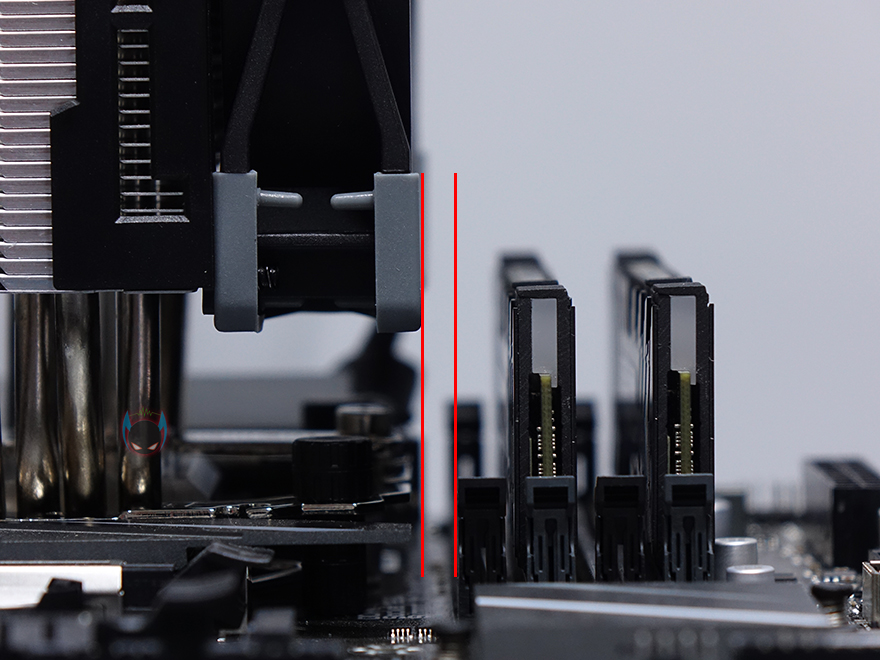 그럼, 이제 써멀테이크 TOUGHAIR 310 CPU쿨러의 냉각 성능을 확인해봐야하는데, 그전에 먼저 장착을 해야겠죠. 장착법은 제공되는 설명서를 참고하면 어렵지 않게 장착할 수 있으며, 실제로 장착해보면, 다른 제품들에 비해 비교적 쉬운편입니다. 일단, 인텔/AMD 공용 백플레이트에 자신이 사용하는 CPU에 맞춰서 백플레이트에 나사를 끼워줍니다. 그리고나서, 메인보드 후면에서 백플레이트를 끼우고, 백플레이트 나사부분에 스탠드-오프를 끼워주고, 그 위에 마운트를 올린 다음, 마운트 나사로 마무리 체결해주면 됩니다. 마운트 나사는 핸드-스크류라 편리하고, 사실상 드라이버 공구 사용은 마지막에 쿨러를 올려놓고 리텐션로 체결할 때만 사용되기 때문에, 앞서 말했듯이 장착법이 비교적 쉬운 편입니다. 쿨러 장착이 끝나면, 팬까지 장착해서 마무리하면 되고, 장착 후 메모리 슬롯과의 간섭여부를 확인해보면, 쿨러와 가장 가까운 1번 슬롯과 간섭이 없다라는 것을 확인할 수 있습니다.