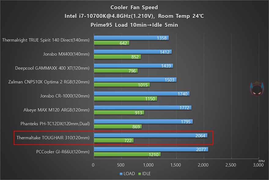 진행동안에 TOUGHAIR 310 CPU쿨러의 팬 속도와 소음을 확인해보면, Load상황에선 최대속도수준으로 작동되는 것을 확인할 수 있으며, 5분간의 Idle 상황에선 700PRM대까지 낮아지는 것을 확인할 수 있었습니다. 전체 비교 쿨러들과 비교해보면 Load에선 높은 속도편이고, Idle에선 낮은 편에 속하는 것을 확인할 수 있는데, Idle 상황은 시간이 지날수록 팬 속도가 더 낮아집니다. 그리고, 소음을 측정해본 결과, Load에선 약 51.2dB(A), Idle에선 약 39.4dB(A)로, 전체 비교 쿨러들 중 중간위치인 것을 확인할 수 있습니다. 결론적으로 앞서 언급했듯이, 제공되는 팬이 높은 속도에 비해서 팬 소음은 낮은 편이라는 것을 알 수 있죠. 그래서, TOUGHAIR 310 CPU쿨러가 슬림한 폭을 가졌음에도 냉각성능이 좋은 것은 팬의 영향이 가장 크다고 볼 수 있습니다.