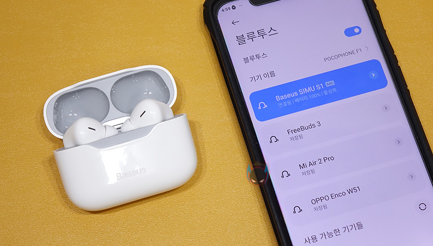 그리고, 베이스어스 SIMU S1 무선이어폰은 스마트폰 제조사들처럼 무선이어폰 지원의 별도 앱(App) 지원이 없습니다. 그래서, 모바일기기와 기본적으로 블루투스 연결이 되면 블루투스 설정메뉴에서 배터리 잔량을 확인할 수 있으며, 방금 말한 터치컨트롤 기능들도 변경할 수 없습니다. 대신에 좌우 이어폰 구분없이 동일하게 터치 기능을 실행시켜줍니다. 끝으로, SIMU S1 무선이어폰을 통한 사운드체감은 중간 볼륨까지는 다른 무선이어폰 제품들과 큰 차이가 없으면, 최대볼륨으로 들었을 때는 음성보다는 비트쪽에 좀 더 날카로운 느낌을 줍니다. 그래도, 최대볼륨으로 했을 때 청력 부담감이 강한 편은 아니라 가격대비 사운드 밸런스는 나쁘지 않게 잡혀있는 편이라 할 수 있겠습니다.