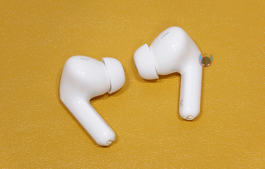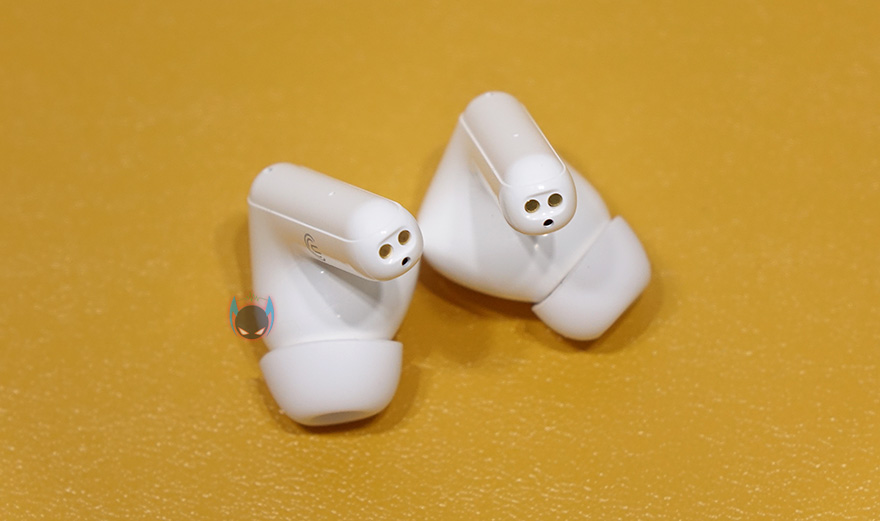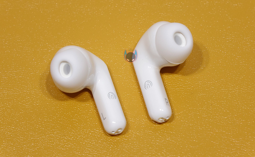 이번엔 이어폰을 살펴보는데, 이어폰은 커널형 이어폰으로 A사 제품과 유사하면서도 좀 더 각진 곡선 디자인을 가지고 있습니다. 색상은 케이스 색상에 맞춰서 적용되고, 막대 길이 역시 A사 제품처럼 긴 편은 아닙니다. 그리고, 터치컨트롤 즉 센서부분이 일반적으로 무선이어폰을 착용했을 때 바깥쪽 정면이 아닌 측면에 적용되어 있습니다. 그래서, 센서부분까지 표시를 해놨으며, 막대 정면쪽에는 윗부분에 노이즈 캔슬링을 해주는 마이크, 아랫부분에는 이어폰 배터리나 연결상태를 확인할 수 있는 LED 인디케이터가 적용되어 있습니다. 마이크는 방금 말한 부분 외에도 막대 밑바닥부분인 충전접지 부분에도 하나 더 적용되어 있어서, 각 이어폰당 듀얼 마이크를 적용하고 있으며, 이어폰 내부에 드라이버 유닛은 앞서 주요 특징 표기에서 확인했듯이 10mm 크기가 탑재되었고, 각 이어폰 당 배터리 용량은 40mAh 입니다.