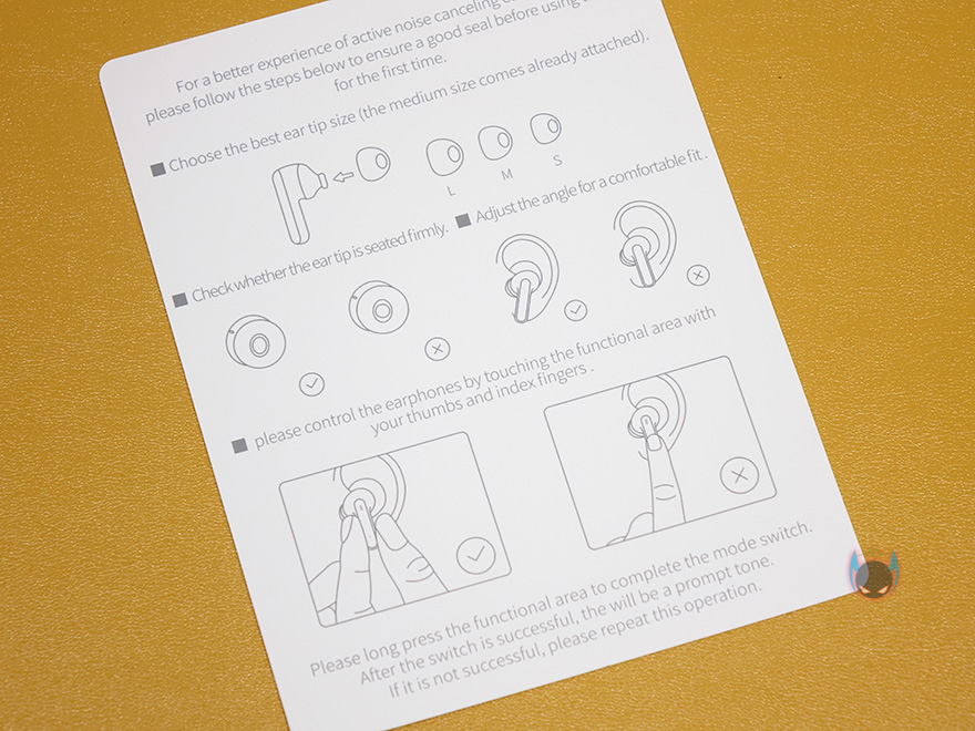 박스 측면에는 제품의 주요 특징으로 주변 소리모드 쉽게 말해 ANC기능을 말하며, 블루투스 5.1 버전, 10mm 다이나믹 드라이버유닛, LSD 안테나를 표기해놨으며, 반대쪽 측면에는 제품 구성 목록을 표기해놨습니다. 그리고, 박스 후면에는 제품의 기본사양을 표기해놨는데, 배터리용량부터 ANC 기능 사용 유무에 따른 사용시간, 대기 사용시간, 주파수 대역, 크기, 무게까지 상세하게 표기해놔서 구입 전 도움이 되겠습니다. 박스를 열어보면, 부속품들은 별도의 박스포장을 한 번 했으며, 이어폰과 충전케이스는 외부 충격방지와 흔들리지 않게 스펀지로 포장이 되어있습니다. 제품 구성은 SIMU S1 충전케이스, 이어폰, 이어-팁, 충전케이블, 제품설명서, 퀵-가이드, 보증서, 스티커 제공으로 이루어져 있으며, 이어-팁은 X/M/S 3가지 크기별로 제공되고, 퀵-가이드를 통해 쉽게 사용법을 숙지할 수 있겠습니다.