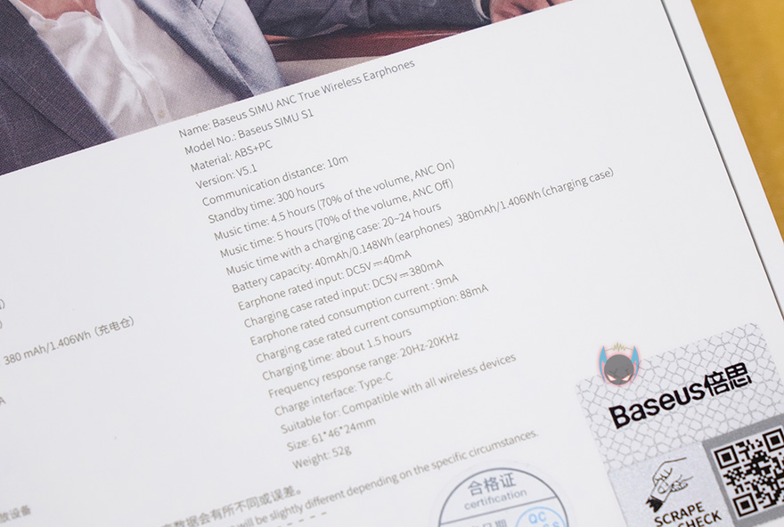 그동안 베이스어스 제품들을 꾸준히 봤지만, SIMU S1 무선이어폰은 제품박스 전체까지 밀봉처리가 되어 있습니다. 아무래도 다른 제품들보다는 음향제품이다보니 좀 더 포장에 신경을 쓸 수 밖에 없다고 생각합니다. 그리고, 박스 개봉전에 늘 그랬듯 이 제품 역시 전면에 제품 이미지를 담고 있어서, 미리 디자인을 알 수 있는데, 참고로 무선충전까지 지원하는 S1 Pro 역시 디자인을 동일합니다. 그리고, 모델명과 함께 액티브 노이즈 캔슬링(ANC) 기능표시도 확인할 수 있죠.