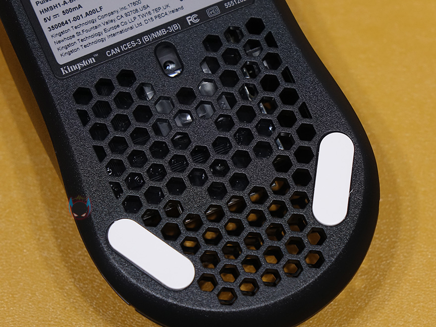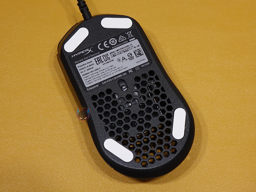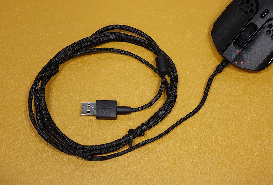 그리고, 마우스 밑바닥부분에는 전반 조금 넘게 타공망 처리를 해놨으며, 위 아래 모서리 부근으로 스케이트 흔히 말하는 테프론피트를 부착해서 마우스 움직임이 부드럽도록 했습니다. 가운데 센서는 광-센서부분으로 내부에 이미 제품박스에서 확인했듯이 Pixart사의 PMW3335 센서가 탑재되어 있습니다. 끝으로, 케이블 역시 제품박스 표기에서 확인했듯이, 꼬임방지를 위해 파라코드 소재로 사용되었으며, 신호손실 최소화를 위해 노이즈필터로 적용되어 있으며, 케이블 길이는 1.8m에 USB 연결인터페이스를 갖추고 있죠.