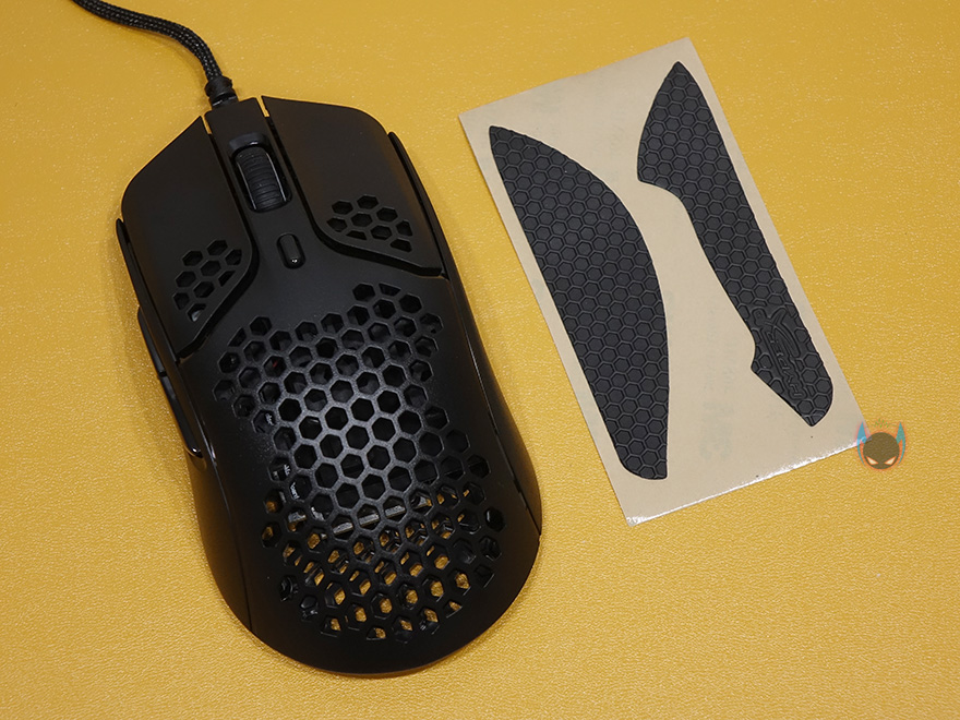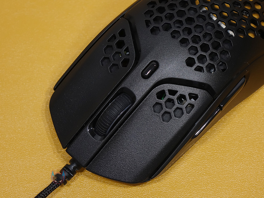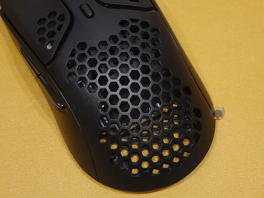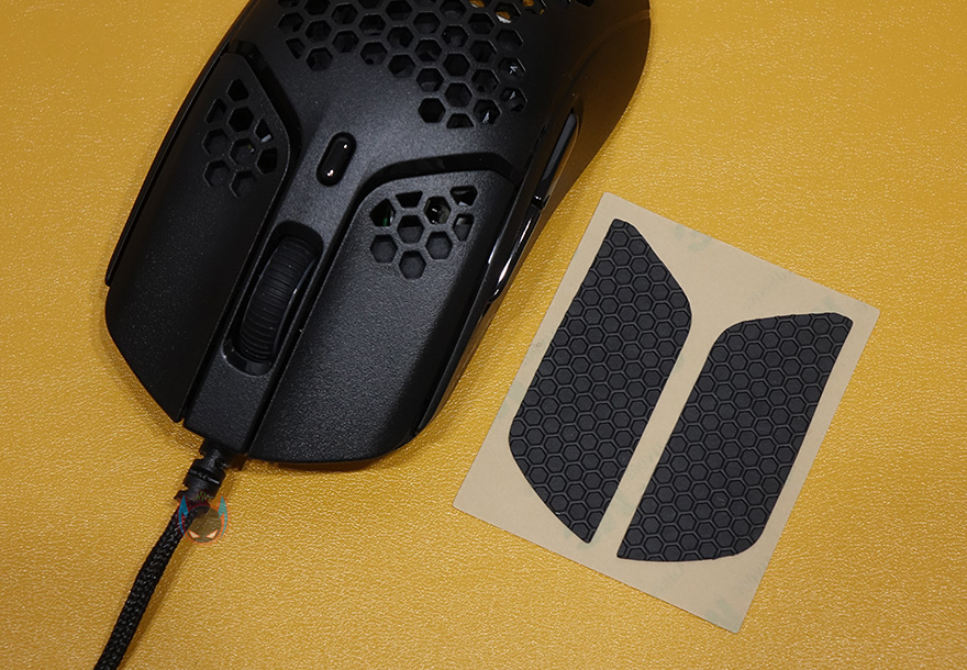 그리고, 펄스파이어 헤이스트 역시 무게를 줄이는 방법으로 다른 경쟁사 제품들처럼 타공망 디자인을 적용했는데, 손바닥과 맞닿는 팜-레스트 부분이 가장 많은 타공망 처리가 되어있으며, 기본 좌우버큰 클럭부분 역시 뒷부분에 타공망처리를 일부 해놨습니다. 또한, 클릭 정확성을 위해 각 버튼 커버는 분리설계로 적용되었고, 가운데 휠-버튼 부분은 뒤에서 확인하겠지만, 유일하게 라이팅 효과를 볼 수 있는 부분입니다. 그리고, 그 뒤로는 DPI 버튼이 배치되어 있죠. 물론, 좌우버튼의 그립이 기본형태에서 부족하다 싶으면 추가로 제공되는 그립 테이프를 부착하면 됩니다.