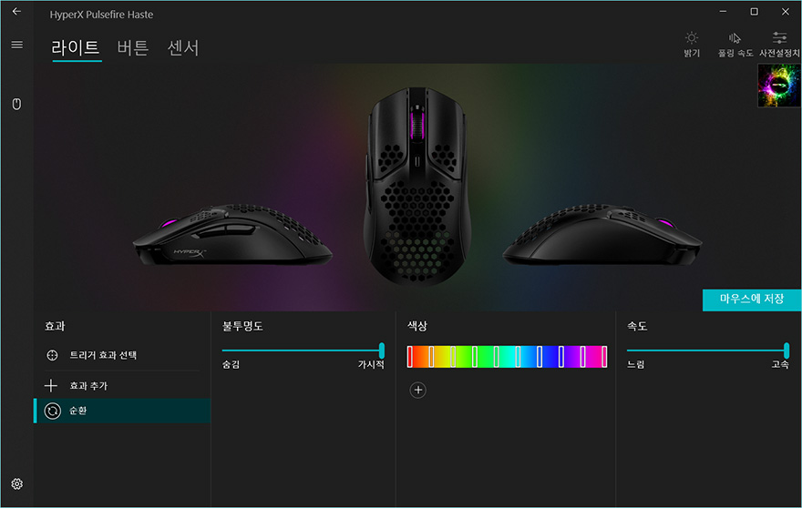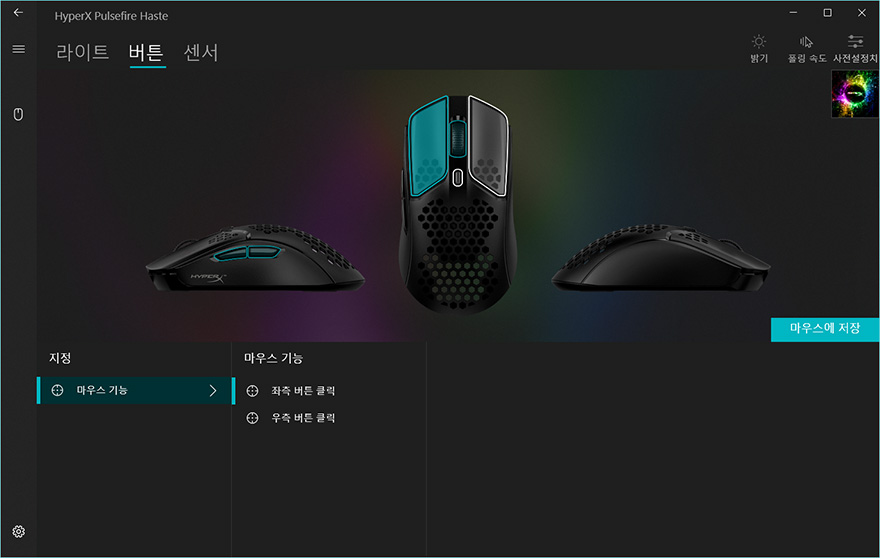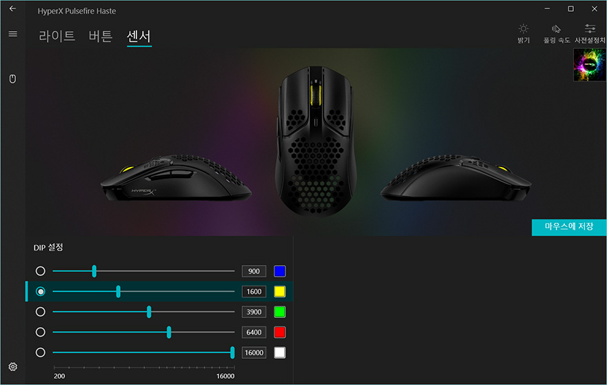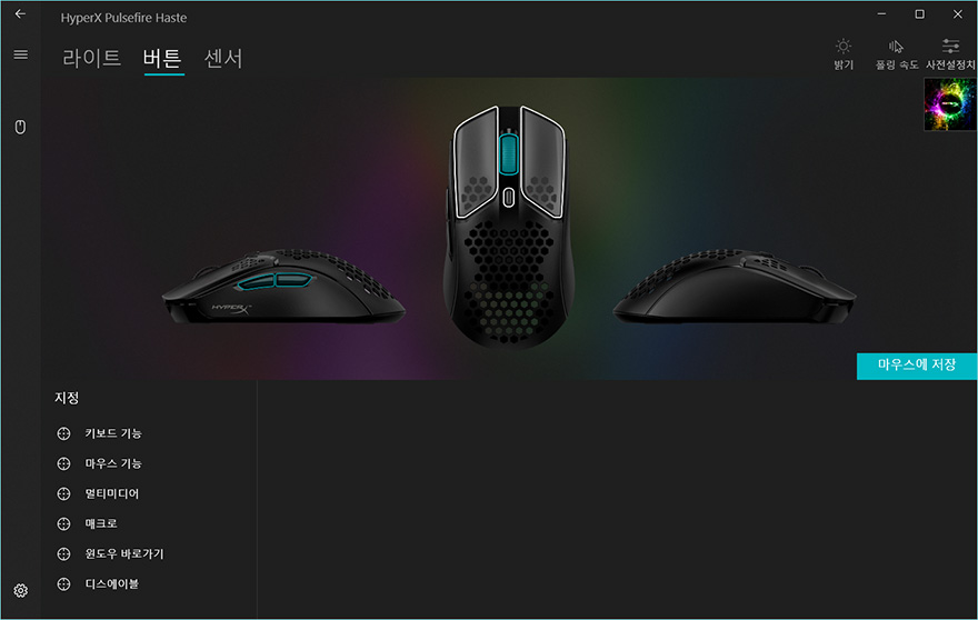 펄스파이어 헤이스트 역시 하이퍼X의 공용 소프트웨어 NGenuity를 지원하는데, 연결된 상태에서 프로그램을 실행해보면 메뉴는 크게 라이트/버튼/센서로 기존의 자사 마우스 제품들과 큰 차이는 없습니다. 다만, 라이트 같은경우에는 아무래도 훨-버튼에만 RGB효과를 적용해놨기 때문에, 효과모드는 트리거할 때를 포함해 총 4가지정도만 지원하고 있습니다. 이 밖에 버튼메뉴에선 기본 좌우버튼은 서로 기능을 바꿀 수 있고, 나머지 휠-버튼과 측면버튼, DPI 버튼은 키보드기능부터 매크로 등 크게 6가지 기능으로 변경할 수 있게 지원하고 있습니다. 그리고, 센서 메뉴에선 DPI값을 설정할 수 있는데, 최소 200~최대 16,000 DPI까지 100단위로 조절할 수 있습니다. 그리고, 전송제어속도도 4가지 중 선택할 수 있습니다.