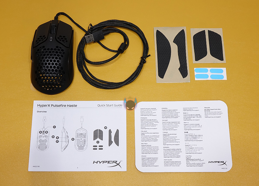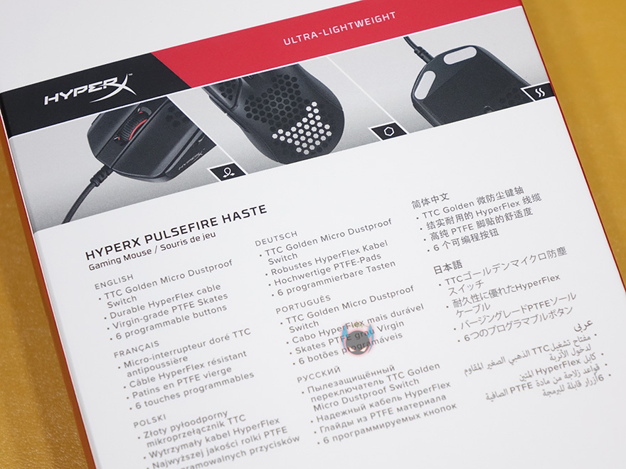박스 후면엔느 추가적으로 제품 특징을 더 표기해놨는데, TTC 골든 마이크로 방진 스위치, 테프론피트, 6개의 버튼 지원 언급을 추가로 확인할 수 있습니다. 그리고, 맨 아래에는 제품 구성목록도 확인할 수 있죠. 박스를 열어보면, 펄스파이어 헤이스트 마우스는 흔들리지 않게 캡-포장을 해놨으며, 구성품은 펄스파이어 헤이스트 마우스, 그립테이프, 여분의 테프론피트, 제품설명서로 이루어져 있습니다.