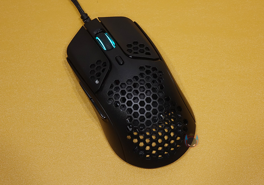 그럼, 하이퍼X의 펄스파이어 헤이스트 게이밍 마우스 외형을 살펴보면, 색상은 올-블랙이며, 무게는 앞서 주요 특징에 표기했던 것처럼 케이블을 제외한 마우스 자체의 무게는 59g입니다. 일반적으로 현재 초경량 게이밍마우스라면 보통 60g대 범위에서 많이 적용하는데, 이 제품은 1g이 더 적은 50g대 무게로 적용한거죠. 초경량 마우스라고해서 무조건 가벼울수록 좋은 것은 아닙니다. 너무 가벼우면 오히려 마우스 그립감각을 느끼지 못하기 때문에 컨트롤이 쉽지 않습니다.