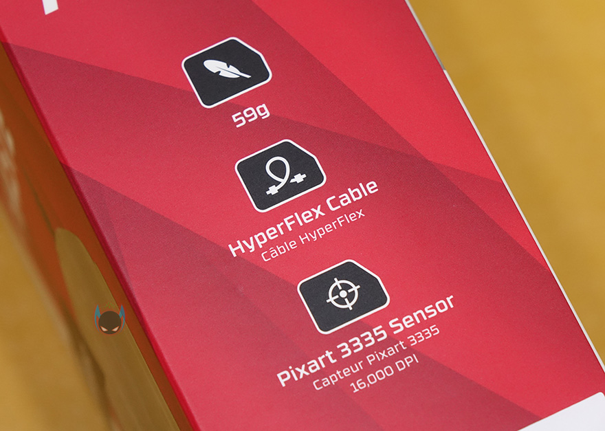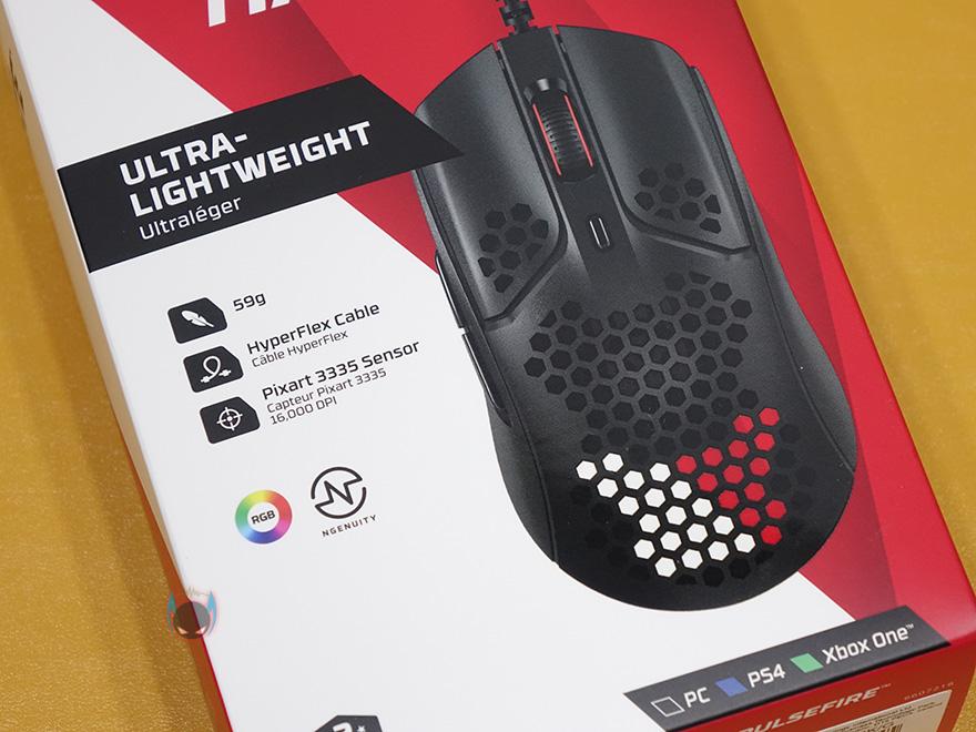 제품팩키지부터 살펴보면, 늘 그래왔듯이 하이퍼X 제품들은 박스 전면에 제품이미지를 담고 있죠. 펄스파이어 헤이스트 마우스 역시 박스 전면에 제품 이미지를 담고 있어서, 모델명과 함께 미리 디자인을 확인할 수 있는데, 초경량 마우스컨셉답게 타공망 디자인을 적용하고 있습니다. 이부분은 좀 더 실물 확인해서 다시 언급하고, 제품의 주요 특징으로는 59g의 가벼운 무게, 케이블꼬임방지의 파라코드 케이블, Pixart 3335 광센서를 표기해놨습니다. 물론, 요즘 트랜드에 맞춰서 RGB효과와 하이퍼X의 공용 소프트웨어 NGenuity 지원표기도 되어있죠. 조금 특별하다면, 단순히 PC에서만 지원하는게 아니라 콘솔기기에서도 지원한다라는 표기를 확인할 수 있습니다.