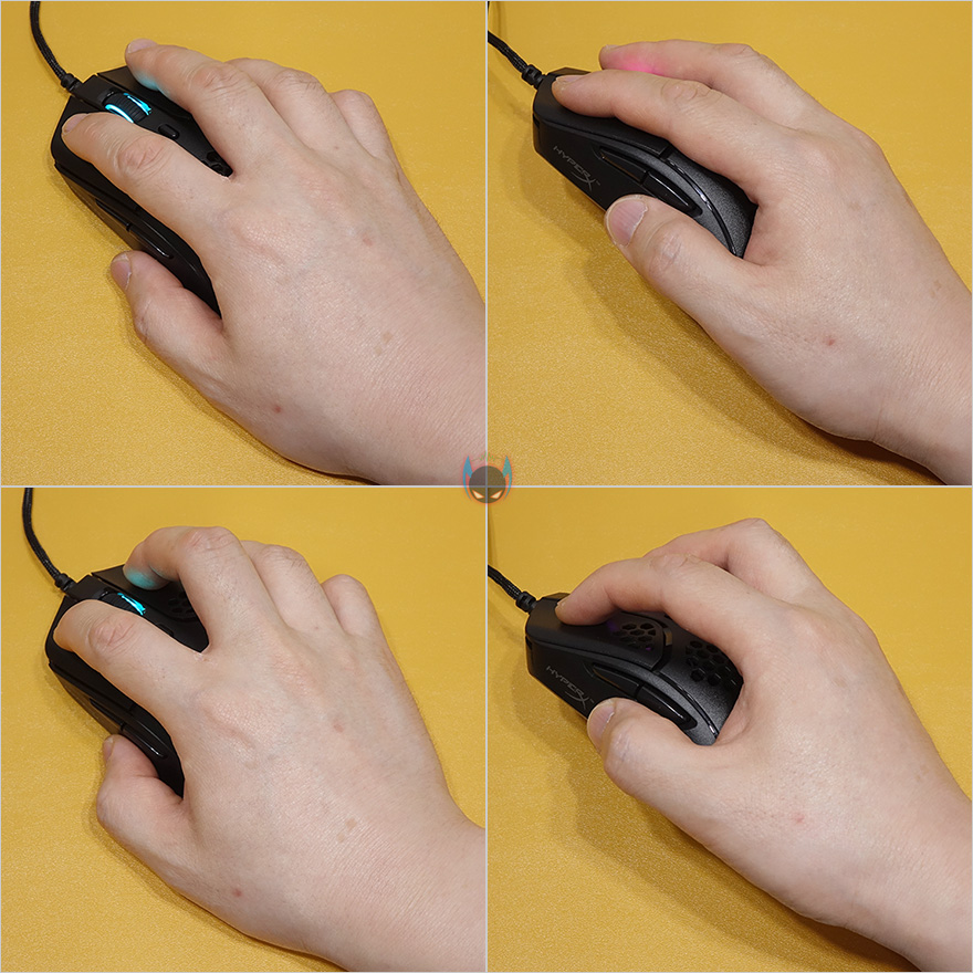 실제로 펄스파이어 헤이스트 게이밍마우스를 사용해보면, 별도의 드라이버 설치없이 PC와 연결하면 바로 인식이 되고, 앞서 언급한대로 이 제품에 유일하게 라이팅효과, 그러니깐 RGB효과를 볼 수 있는 부분은 휠-버튼입니다. 연결했을 시, 기본 작동모드는 순환모드입니다. 그리고, 그립에 대해서 언급을 하자면, 필자의 경우 딱 F10 손크기르 가졌는데, 펄스파이어 헤이스트는 기본 팜-그립은 물론 클로 그립도 가능하며, 측면버튼 사용빈도가 낮다면 핑거 그립까지도 소화할 수 있는 적당한 크기를 가졌습니다. 다만, 무게가 59g으로 초경량 마우스에서도 가벼운 편에 속하기 때문에 처음부터 초경량 마우스를 사용했던 사용자는 익숙하겠지만, 무게감 있는 마우스를 사용했던 사용자라면 익숙함에 조금 시간이 걸릴 수도 있습니다. 그만큼 초반에는 많이 가볍다고 느껴질 수 있다라는거죠.