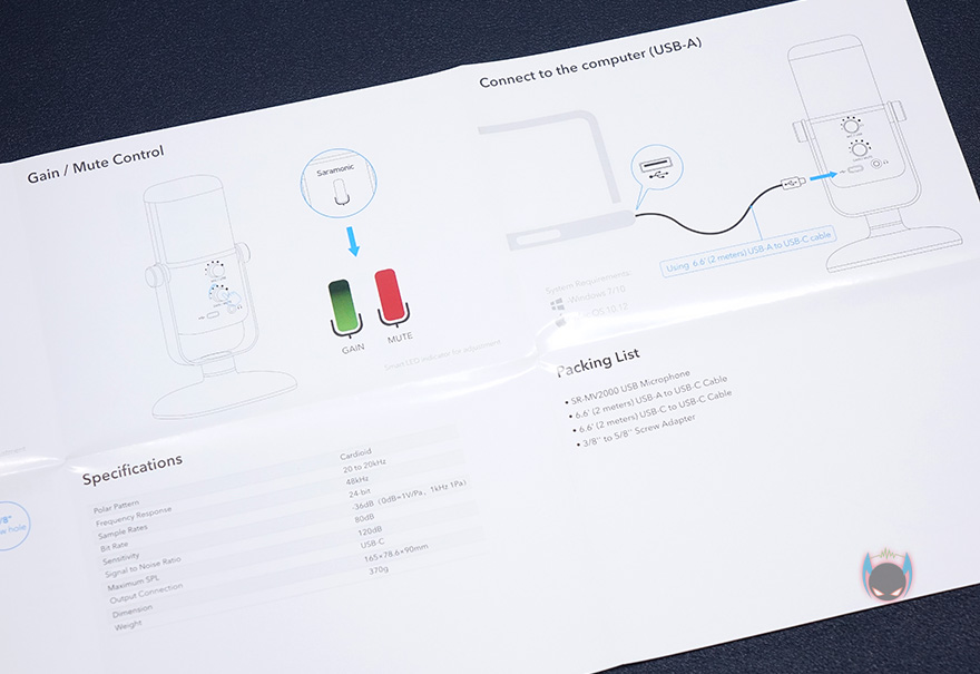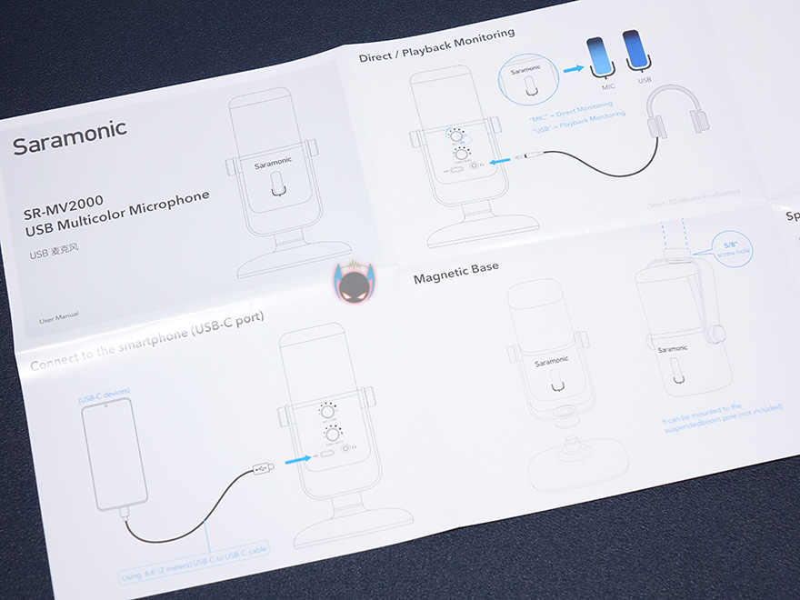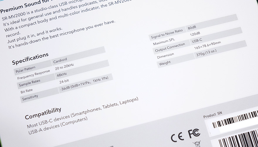 제품 포장은 속박스로 한 번 더 사용했는데, 박스를 열어보면, SR-MV2000 마이크가 외부 충격방지와 흔들리지 않게 스트로폼으로 포장된 것을 확인할 수 있으며, USB 케이블은 2개가 제공되는데 별도의 박스에 담겨져 있습니다. 포장이 고급스럽다라는 느낌이 들정도 나름 신경을 썼습니다. 제품구성은 SR-MV2000 마이크, USB Type-C to A 케이블, USB Type-C to C 케이블, 3/5" 스크류 변환어댑터, 제품설명서, 보증서, 로고스티커 제공으로 구성되어 있으며, USB 콘덴서 마이크 제품답게 설명서만 봐도 제품사용법이 간단하다라는 것을 알 수 있습니다.