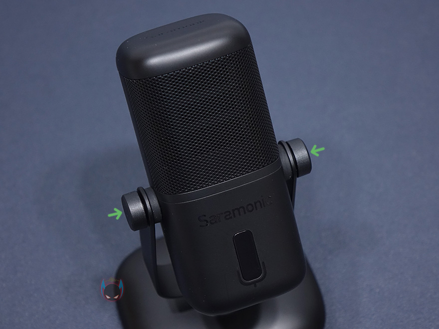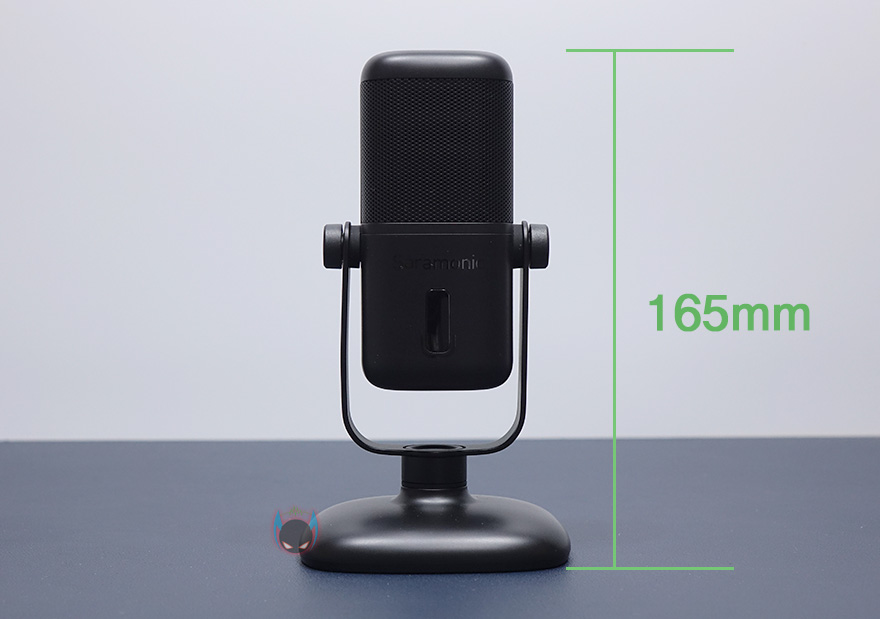 그럼, 사라모닉 SR-MV2000 USB 콘덴서 마이크를 살펴보면, 색상은 전체적으로 블랙색상이며, 스탠드 바닥부터 마이크 제일 윗부분까지 높이는 165mm, 무게는 제품사양에 표기된 것처럼 오차범위로 373g을 가졌습니다. 최근 출시되는 게이머컨셉까지 생각한 USB 콘덴서 마이크 제품들이 이런 아담한 사이즈로 나오는데, SR-MV2000 역시 트랜드를 따라간다 할 수 있습니다. 마이크는 360도 회전이 가능하며, 각도조절 후 양쪽 나사를 조이면 고정력이 높아집니다. 360도 회전이 가능하기 때문에 자신이 원하는 최적의 각도조절을 찾을 수 있다 할 수 있겠죠.