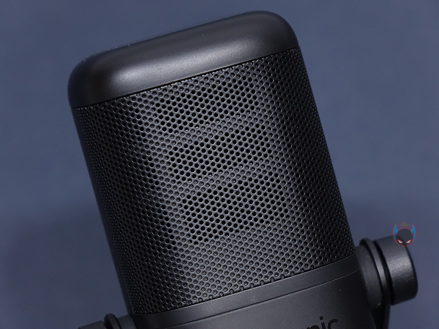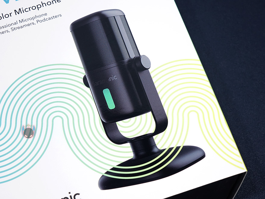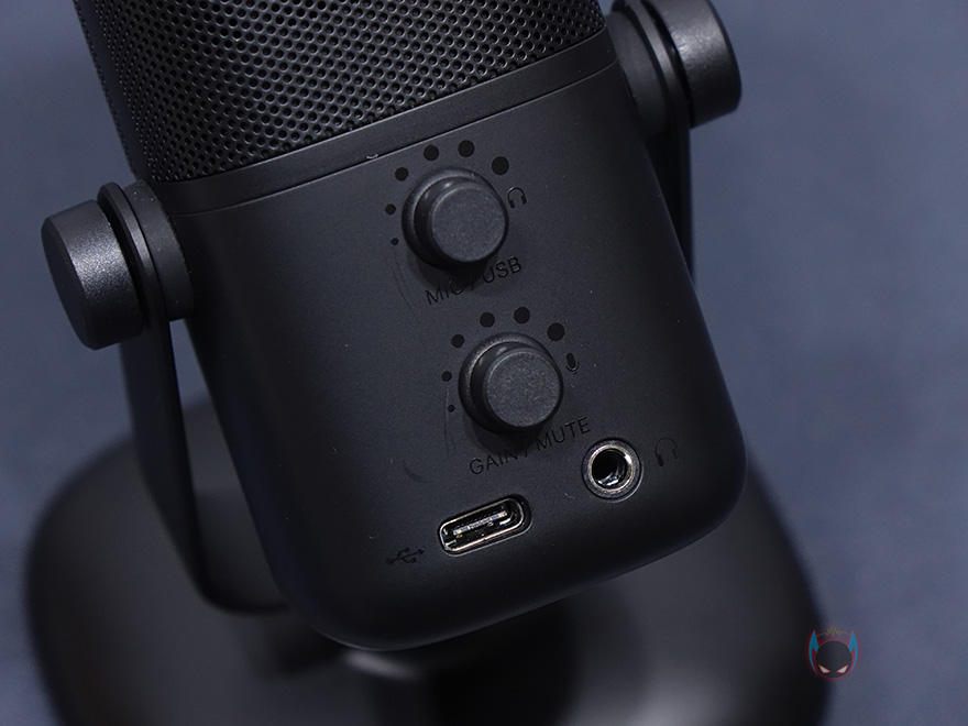 마이크 상단부분에는 사라모닉 로고를 새겨놨으며, 마이크는 앞서 제품 사양에서 언급했듯이 단일지향성 폴라패턴을 지원합니다. 단일지향성은 마이크 바로 앞 전면에 소리를 수음하고 나머지 측면, 후면의 주변 소리 노이즈를 차단하는 것이 특징이죠. 그래서, 1인용 마이크로도 많이 불리우며, 1인 방송이나 보컬, 악기 같은 녹음에 많이 사용됩니다. 소리를 수음하는 마이크 윗부분은 메쉬 디자인과 함께 내부에 팝-필터가 내장되어 있는데, 이런 내장 팝-필터 역시 가장 최근에 나오기 시작한 USB 콘덴서 마이크의 특징이기도 하죠. 물론, 주변 노이즈를 더 감소시키고 싶다면 일반 외부 팝-필터와 함께 사용해도 됩니다. 그리고, 마이크 아랫부분 전면에는 LED 인디케이터가 있는데, 마이크 상태를 한 눈에 쉽게 알아볼 수 있으며, 마이크/USB연결/게인/볼륨 상태를 4가지 색상으로 보여줍니다. 같은 위치의 마이크 후면에는 마이크 다이렉트트&플레이백/볼륨조절 노브, 게인(Gain)/음소거 노브, USB Type-C 포트, 3.5mm 헤드폰 포트가 배치되어 있습니다.
