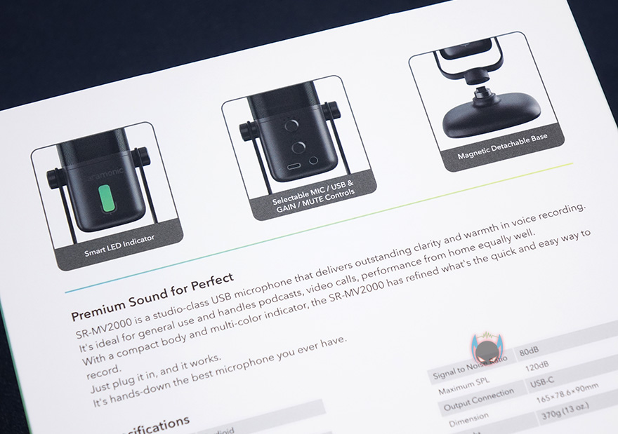 박스 후면에는 제품의 주요 특징으로 LED 인디케이터, 마이크 연결 USB 케이블 선택과 게인(Gain)/볼륨 조절, 마그네틱 분리형 베이스를 언급하고 있습니다. 그 아래에는 제품의 기본 사양을 표기해놨는데, 단일지향성 폴라패턴과 함께 눈길을 끄는 건 샘플링/비트 레이트가 48kHz/24비트까지 지원하는데, 비슷한 가격대의 제품들에선 아직까지 48kHz/16비트 제품들이 많아다라는 점에서 역시 음향 전문회사라 전문가들이 선호하는 산업전용 오디오인터페이스 기준으로 적용했다 생각할 수 있습니다. 참고로, 48kHz/24비트는 흔히 DVD음질이라고 말합니다.
