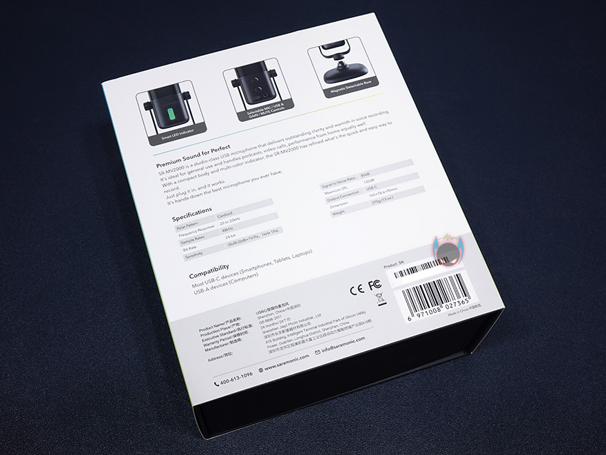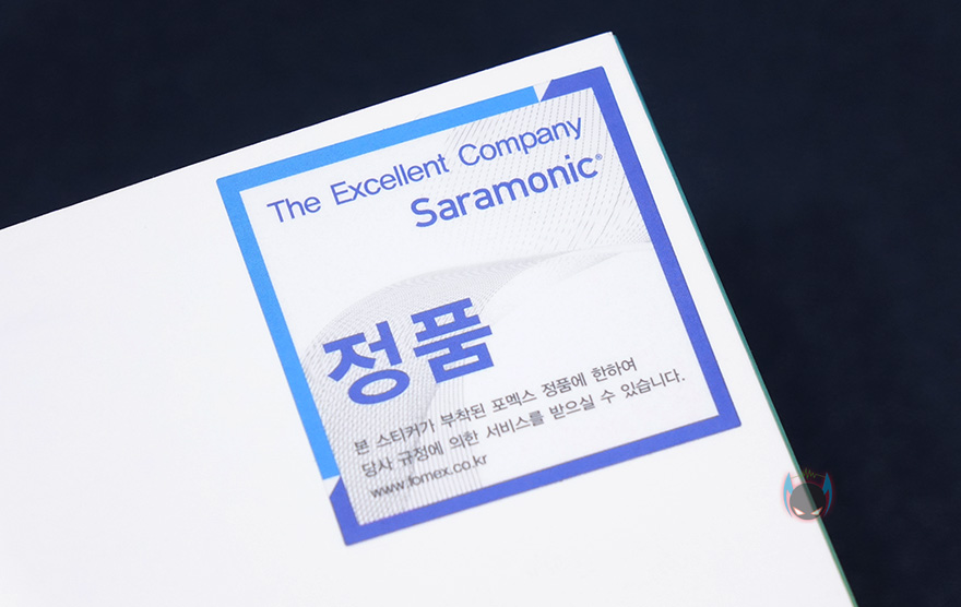 제품박스부터 살펴보면, 박스 전면에는 제품 이미지를 담고 있어서 미리 실물을 접하기 전에 제품 디자인을 확인할 수 있는데, 한눈에 봐도 요즘 트랜드의 USB 콘덴서 마이크라는 것을 느낄 수 있습니다. 쉽게 말해, 보컬이나 팟캐스트용 마이크 느낌도 나지만, LED가 적용되어 있어서 요즘 게임 마이크로 USB 콘덴서 마이크를 많이 사용하는 사용자들에게도 어울릴만한 디자인을 가졌다라는겁니다. 실제로 모델명 아래에 제품 컨셉을 보면 전문적인 마이크 컨셉과 함께 스트리머, 팟캐스터, 그리고 게이머를 위한 디자인이라고 표기를 해놨죠. 그리고, PC와 모바일기기 호환 표기도 확인할 수 있습니다. 또한, 국내에서 판매되는 사라모닉 제품들은 2019년부터 현대포멕스(https://www.fomex.co.kr/) 취급해오고 있어서, 정품스티커도 부착이 되어있는 것을 확인할 수 있죠.