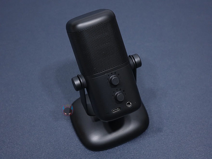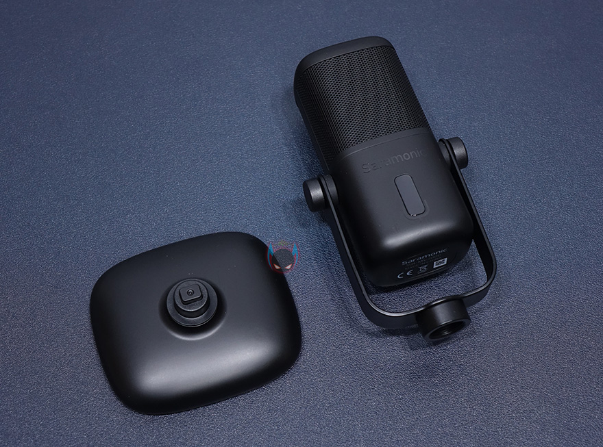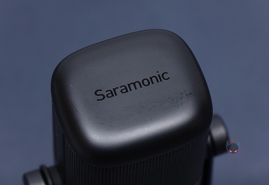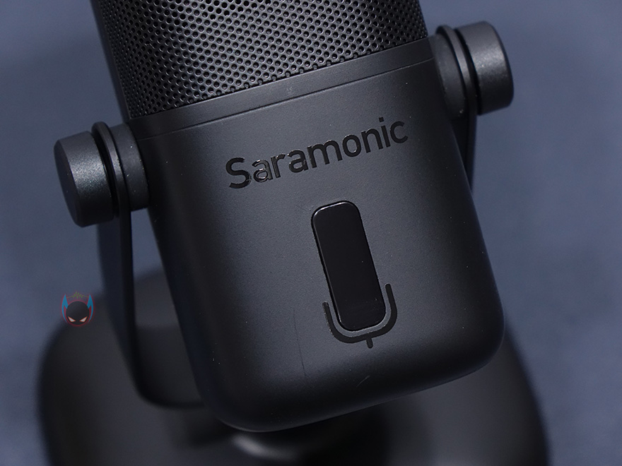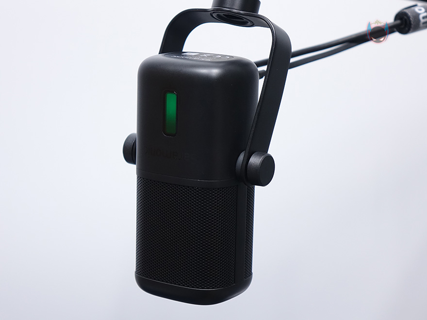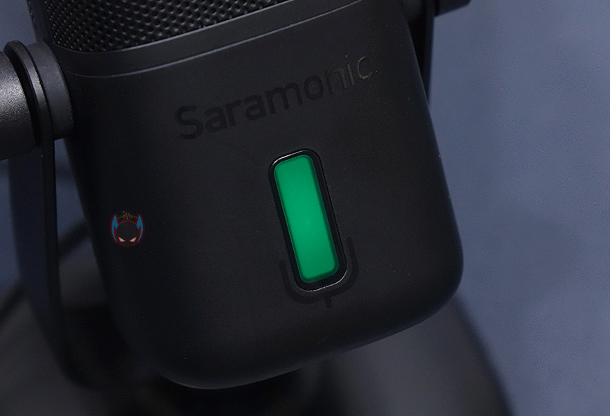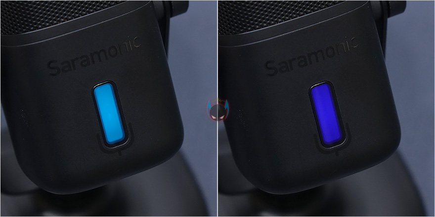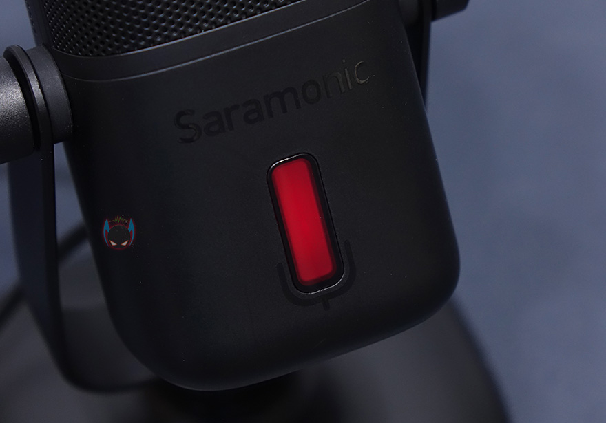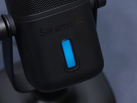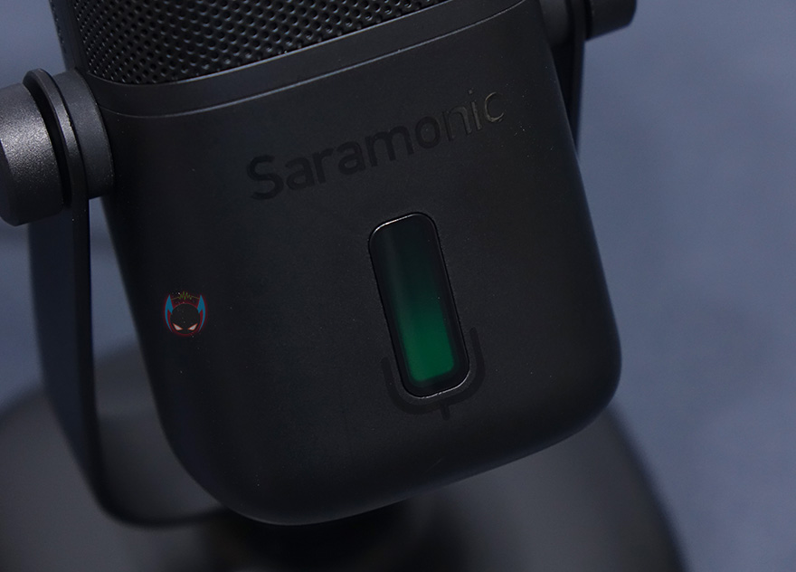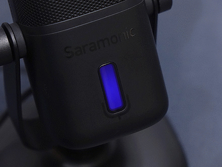 마이크 상단부분에는 사라모닉 로고를 새겨놨으며, 마이크는 앞서 제품 사양에서 언급했듯이 단일지향성 폴라패턴을 지원합니다. 단일지향성은 마이크 바로 앞 전면에 소리를 수음하고 나머지 측면, 후면의 주변 소리 노이즈를 차단하는 것이 특징이죠. 그래서, 1인용 마이크로도 많이 불리우며, 1인 방송이나 보컬, 악기 같은 녹음에 많이 사용됩니다. 소리를 수음하는 마이크 윗부분은 메쉬 디자인과 함께 내부에 팝-필터가 내장되어 있는데, 이런 내장 팝-필터 역시 가장 최근에 나오기 시작한 USB 콘덴서 마이크의 특징이기도 하죠. 물론, 주변 노이즈를 더 감소시키고 싶다면 일반 외부 팝-필터와 함께 사용해도 됩니다. 그리고, 마이크 아랫부분 전면에는 LED 인디케이터가 있는데, 마이크 상태를 한 눈에 쉽게 알아볼 수 있으며, 마이크/USB연결/게인/볼륨 상태를 4가지 색상으로 보여줍니다. 같은 위치의 마이크 후면에는 마이크 다이렉트트&플레이백/볼륨조절 노브, 게인(Gain)/음소거 노브, USB Type-C 포트, 3.5mm 헤드폰 포트가 배치되어 있습니다.