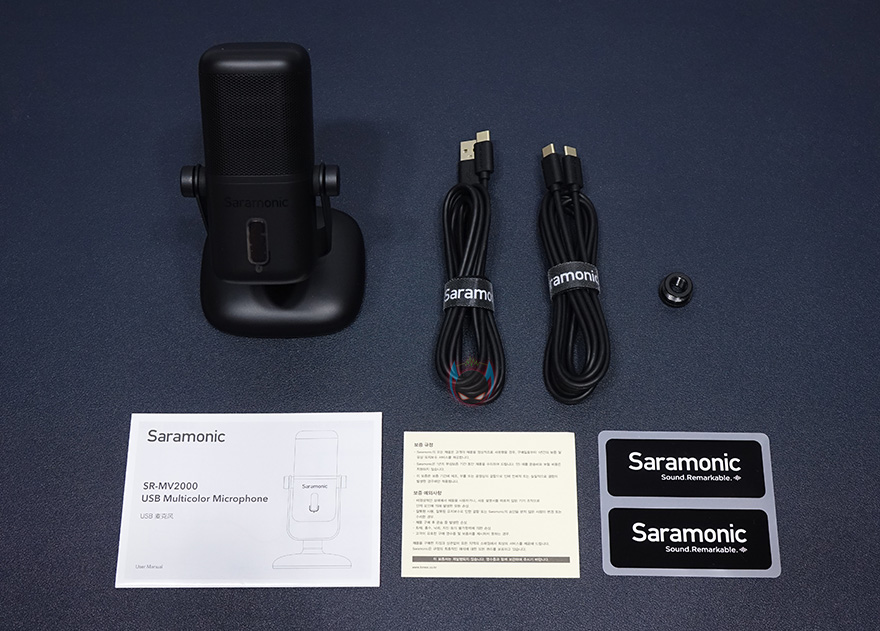 제품 포장은 속박스로 한 번 더 사용했는데, 박스를 열어보면, SR-MV2000 마이크가 외부 충격방지와 흔들리지 않게 스트로폼으로 포장된 것을 확인할 수 있으며, USB 케이블은 2개가 제공되는데 별도의 박스에 담겨져 있습니다. 포장이 고급스럽다라는 느낌이 들정도 나름 신경을 썼습니다. 제품구성은 SR-MV2000 마이크, USB Type-C to A 케이블, USB Type-C to C 케이블, 3/5" 스크류 변환어댑터, 제품설명서, 보증서, 로고스티커 제공으로 구성되어 있으며, USB 콘덴서 마이크 제품답게 설명서만 봐도 제품사용법이 간단하다라는 것을 알 수 있습니다.