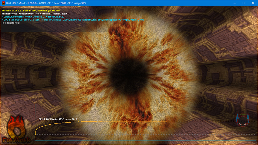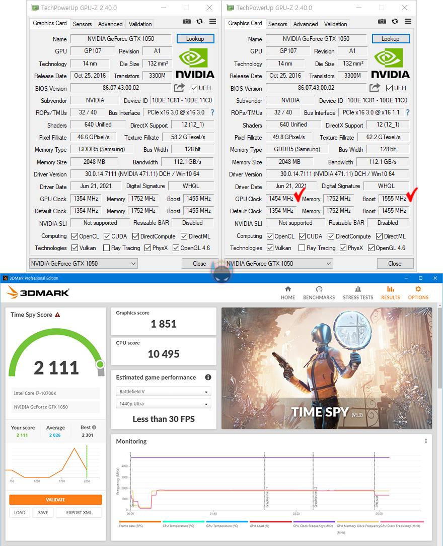 그리고, 앞서 언급한대로 ARKTEK 지포스 GTX1050 그래픽카드는 듀얼 팬 쿨러를 장착하고 있는데, 지포스 GTX1050이 높은 발열을 가진 것은 아니기 때문에 쿨링효과는 충분히 뒷받침될거라 했는데, 실제로 과부하를 통해 온도를 확인해보면, 최대 68℃에서 더 이상 오르지 않는 것을 확인할 수 있습니다. 끝으로, ARKTEK 지포스 GTX1050의 GPU 클럭을 확인해보면, Nvidia 지포스 GTX1050의 표준 클럭으로 적용된 것을 확인할 수 있는데, 발열이 높지 않은 그래픽카드이기 때문에 조금이라도 성능에 욕심을 내고 싶다면, 좀 더 추가적인 오버클럭을 적용해도 괜찮습니다. 실제로 오버클럭이 적용된 다른 경쟁사 제품들수준과 비슷한 클럭으로 오버클럭해 본 결과, 정상적으로 작동되는 것을 확인할 수 있었고, 약간의 성능 향상도 이루어졌습니다.