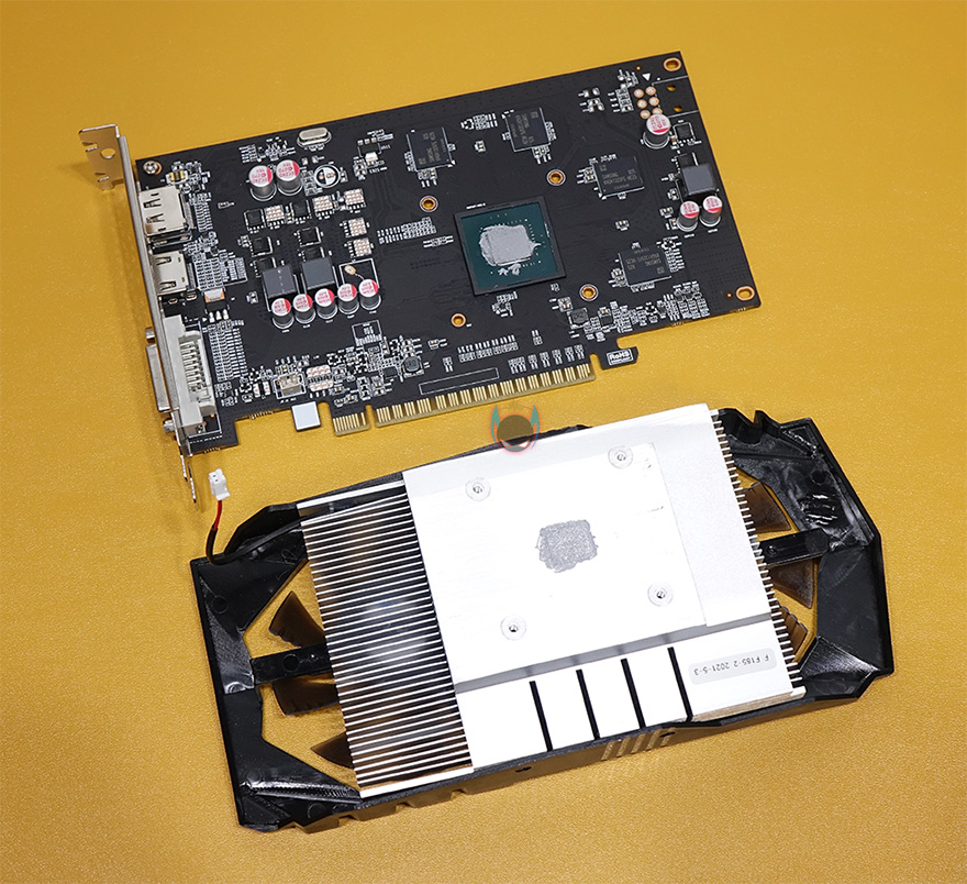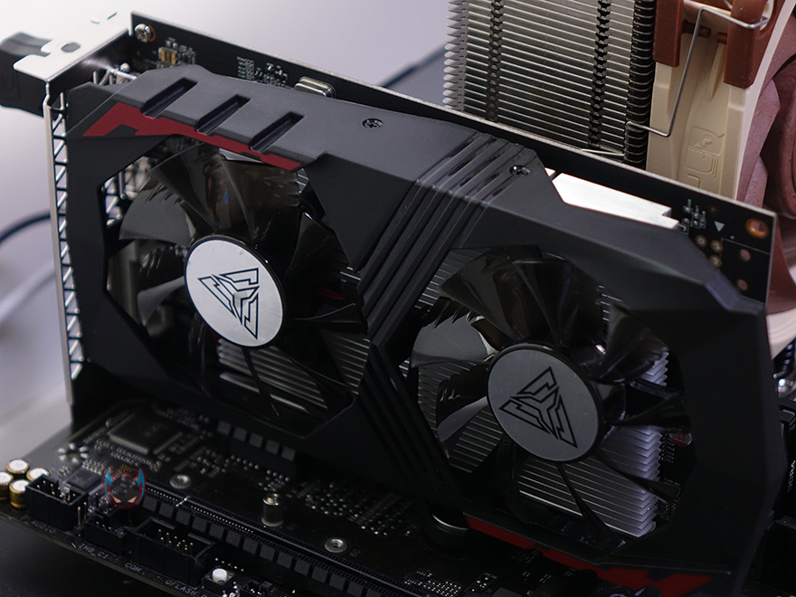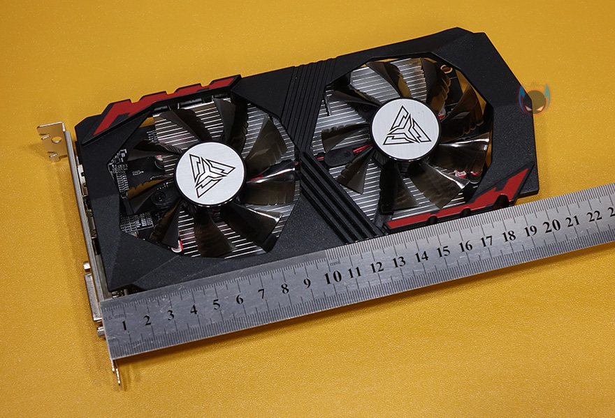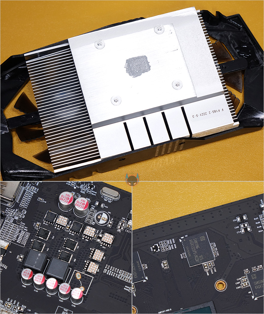 ARKTEK의 지포스 GTX1050 그래픽카드를 살펴보면, 길이는 210mm으로 미들타워는 물론 왠만한 미니타워 PC케이스에서도 대부분 장착될 수 있는 사이즈를 가졌습니다. 그리고, 장착된 쿨러는 듀얼 팬 구성으로 팬은 총 9개의 블레이드(날개)를 가지고 있으며, 날개마다 끝부분에 일명 지느러미라고 부르는 핀-디자인을 적용해놨는데, 보통 이런 디자인들은 풍량을 높이기 위함이죠. 지포스 GTX1050 자체가 높은 발열을 가지진 않았기 때문에 충분히 쿨링 역할은 소화한다 할 수 있겠습니다. 그리고, PCI슬롯 높이는 2단 수준이고, 모니터 출력 포트는 DP, HDMI, DVI 하나씩 갖추고 있으며, 최대 3개의 모니터까지 연결할 수 있겠습니다. 보급형 모델이기 때문에 백플레이트는 적용되어 있지 않고, 쿨러와 PCB기판을 분리해보면, 쿨러 역시 방금 말한대로 지포스 GTX1050이 높은 발열을 가지진 않았기 때문에, 쿨러에 히트파이프 없이 히트싱크만 적용된 것을 확인할 수 있으며, 전원부와 2GB 메모리를 GPU 주변에서 확인할 수 있는데, 메모리는 삼성 DDR5 입니다.
