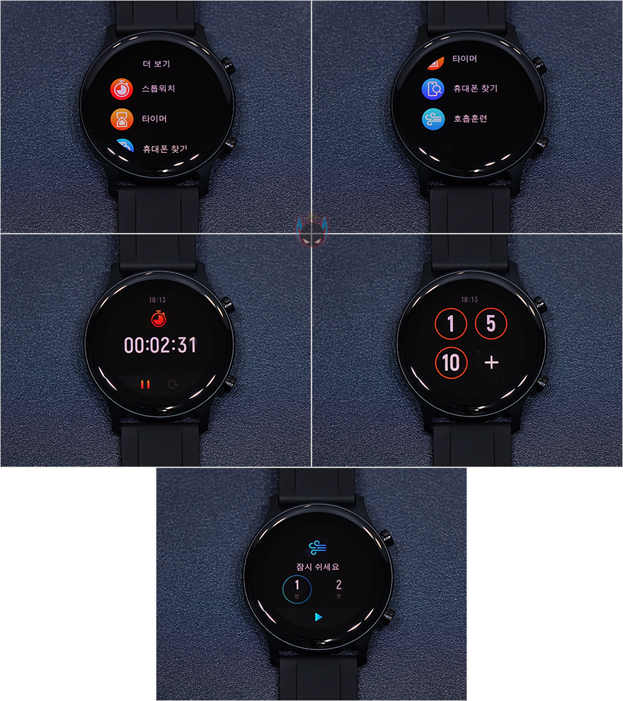 그리고, 기본 메뉴 중에 더보기로 들어가면 추가로 스톱워치, 타이머, 휴대폰찾기, 호흡훈련 메뉴를 볼 수 있는데, 스톱워치는 터치로도 가능하고, 측면 버튼 중 위에 버튼으로도 시작/멈춤을 할 수 있습니다. 그리고, 타이머는 기본설정으로 1분/5분/10분이 있는데, +를 누르면 별도로 사용자가 시간지정을 해서 사용할수도 있습니다. 그리고, 호흡훈련은 1분과 2분으로 진행되는 과정을 보여줍니다. 앞서 측면버튼으로 운동모드를 바로 들어갔듯이, 기본 메뉴 중에 일부는 퀵-메뉴로도 지원되고 있습니다.