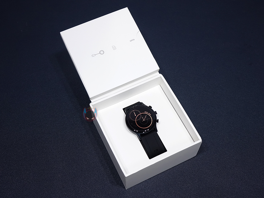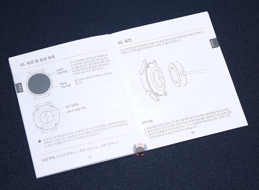 그리고, 겉표지를 벗기면 속박스를 볼 수 있는데, 앞서 겉표지에서 확인했던 워치페이스 이미지 외에 오른쪽에 추가 이미지가 있는데, 뒤에서 확인하겠지만, 이 두 이미지가 제품에 기본설정으로 들어있는 워치페이스 화면입니다. 물론, 어플을 통해서 변경할 수 있죠. 그리고, 박스를 열어보면, 열리는 안쪽에 캐비닛 같은 상자로 되어있는데, 이 안에 부속품으로 충전 크래들과 제품설명서가 들어있죠. 제품구성은 간단하게, 헬로우 RS3 #스마트워치, 충전크래들, 제품설명서로 이루어져 있으며, 제품설명서에 한국어도 포함되어 있습니다.