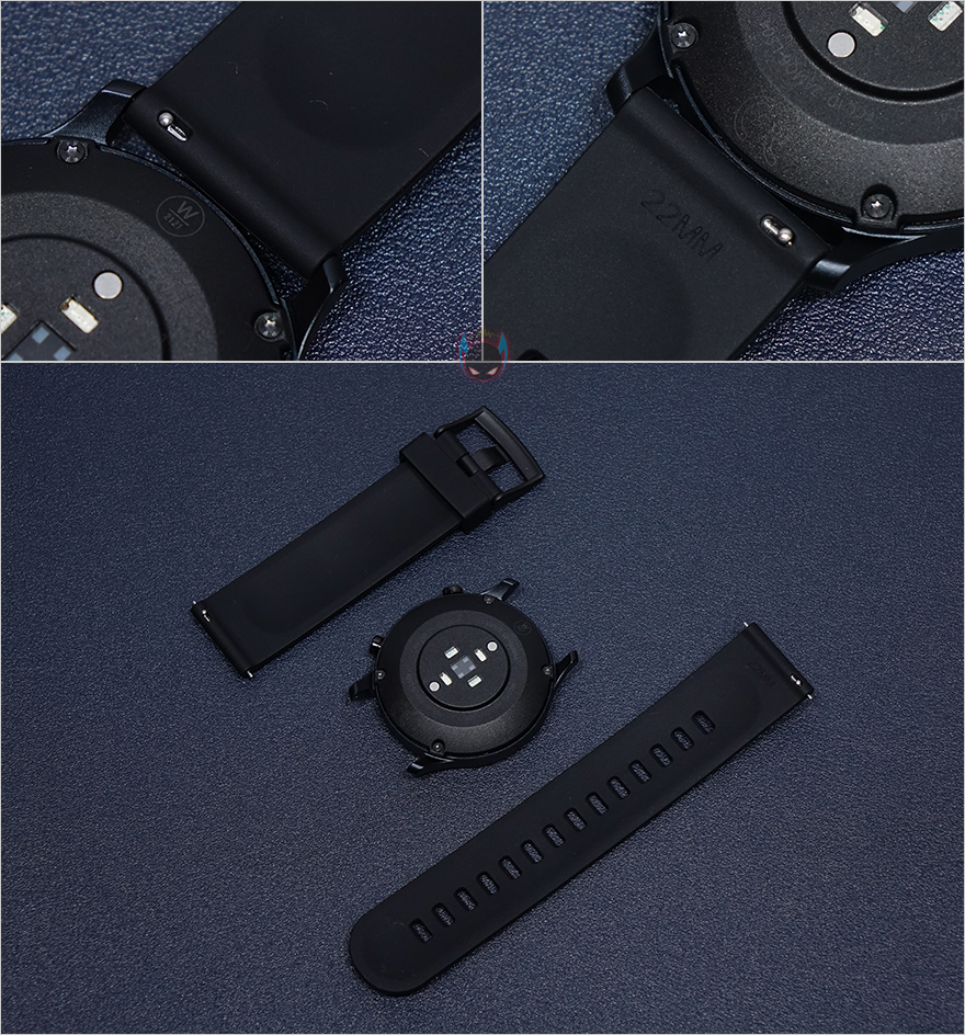 스트랩 재질은 다른 스마트워치 제품들처럼 가장 많이 사용되는 실리콘 재질이며, 폭 역시 22mm로 일반 사이즈라 다른 스트랩으로 교체할 수 있으며, 손목착용 조절을 해주는 구멍은 총 14개입니다. 이정도 구멍이면 일반 성인 남성들은 대부분 착용이 가능하다고보면 되죠. 그리고, 스트랩 교체를 할 수 있게 시계 양쪽 연결부위는 모두 슬라이드 핀 방식으로 옆으로 당기면 쉽게 분리할 수 있습니다. 끝으로, 헬로우 RS3 스마트워치의 무게는 46g 입니다.