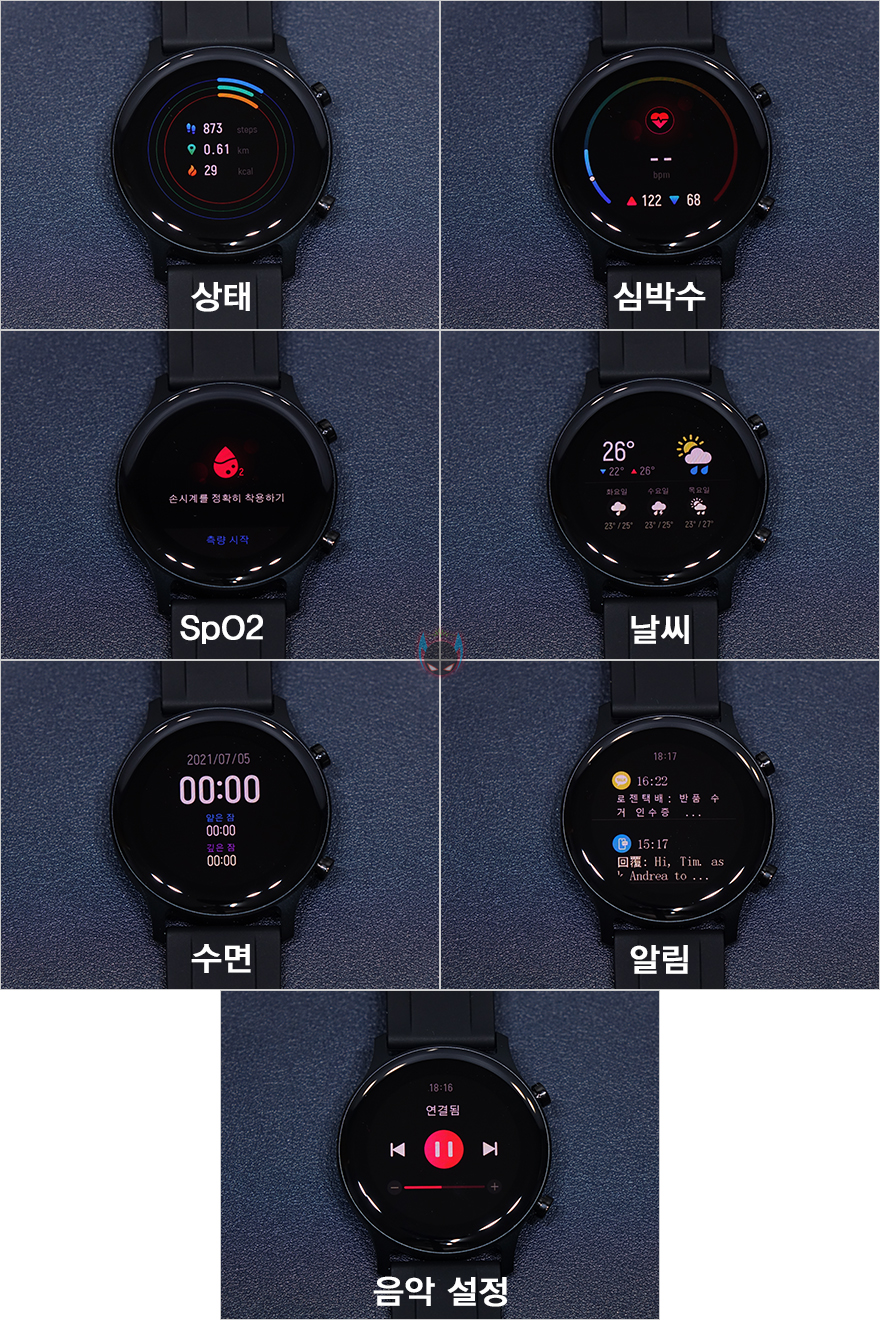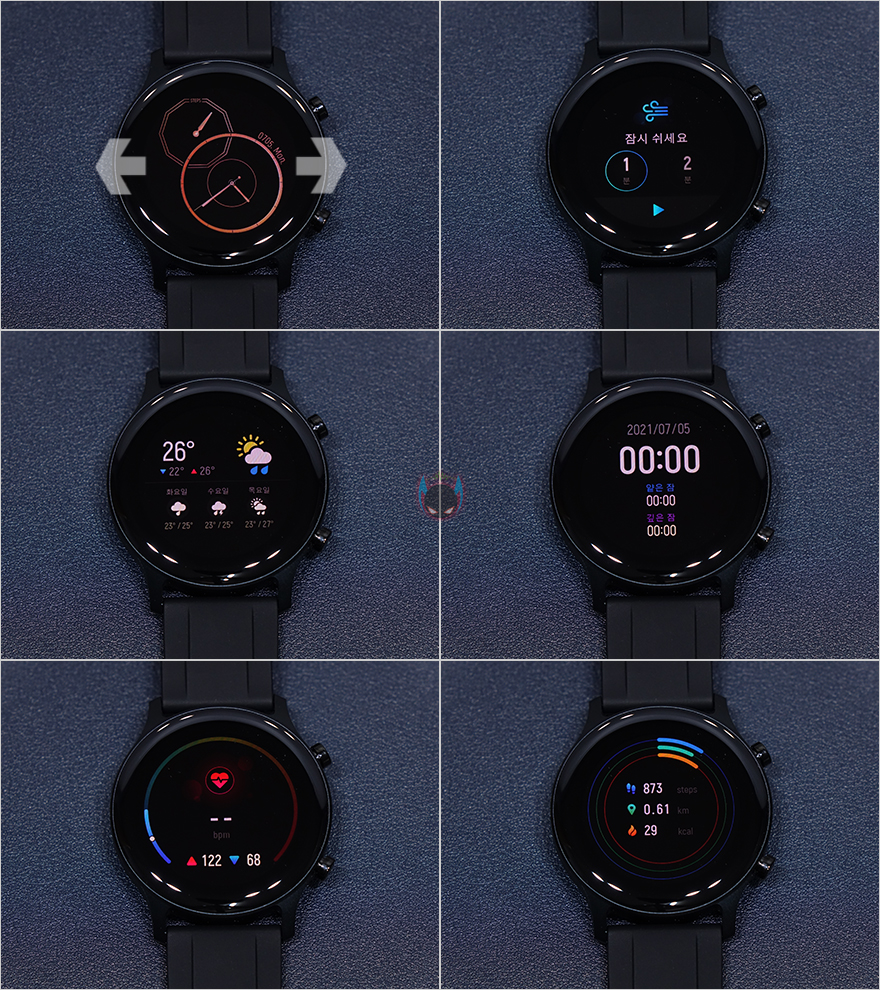 마지막으로 기본화면에서 오른쪽으로 터치 슬라이드하면, 호흡훈련/날씨/수면/심박수/상태 실행작동을 바로 확인할 수 있습니다. 물론, 왼쪽으로 터치 슬라이드하면 보여주는 순서는 반대가 됩니다. 참고로 실행되는 메뉴들은 따로 변경할 수 없습니다.