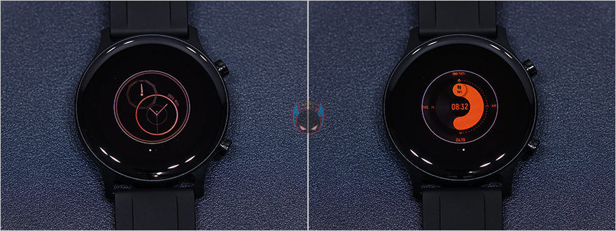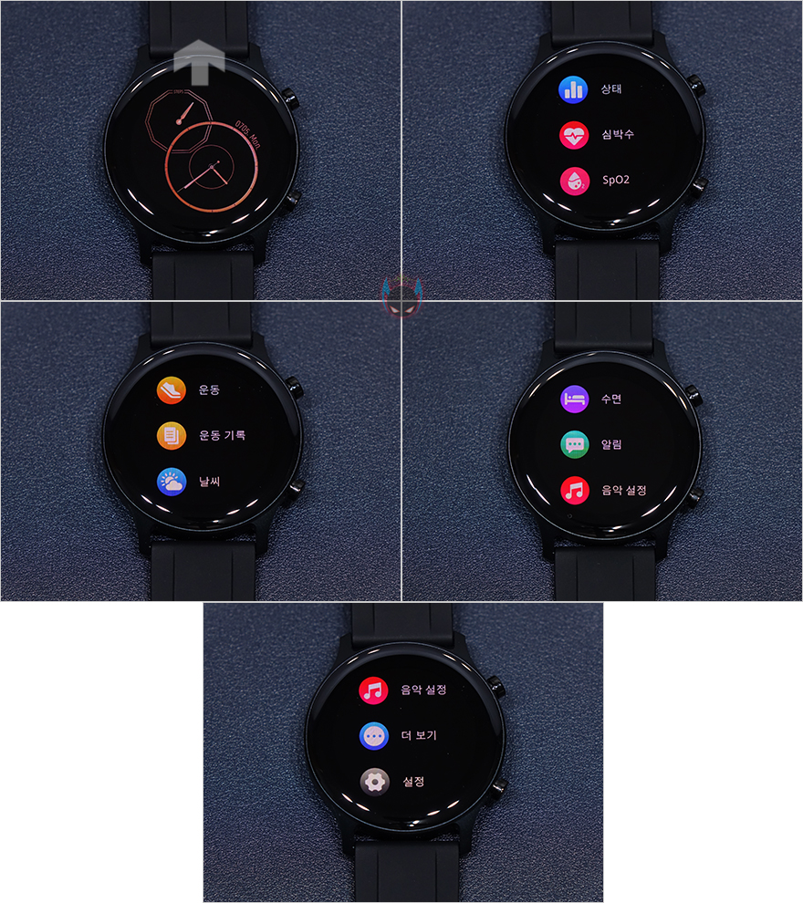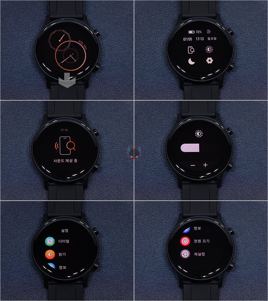 방금 언급했듯이 기본 메뉴 중 일부는 퀵-메뉴로도 지원하고 있다고했는데, 바로 기본화면에서 아래로 터치 슬라이드 하면 휴대폰 찾기, 밝기, 방해금지 모드, 설정으로 바로 갈 수 있는 메뉴가 나옵니다. 휴대폰 찾기는 다른 스마트워치 제품들처럼 일반적인 알람소리가 아니라 연결된 모바일기기의 벨소리가 작동되며, 화면 밝기는 총 4단계로 이루어지고, 기본 메뉴에서 봤던 설정는 방금 언급한 밝기조절 외에도 다이얼, 정보, 전원끄기, 재설정 메뉴를 추가로 확인할 수 있는데, 다이얼은 워치페이스 메뉴로 앞서 속박스에 실렸던 워치페이스 2개의 이미지가 화면이 들어있는 것을 확인할 수 있습니다.
