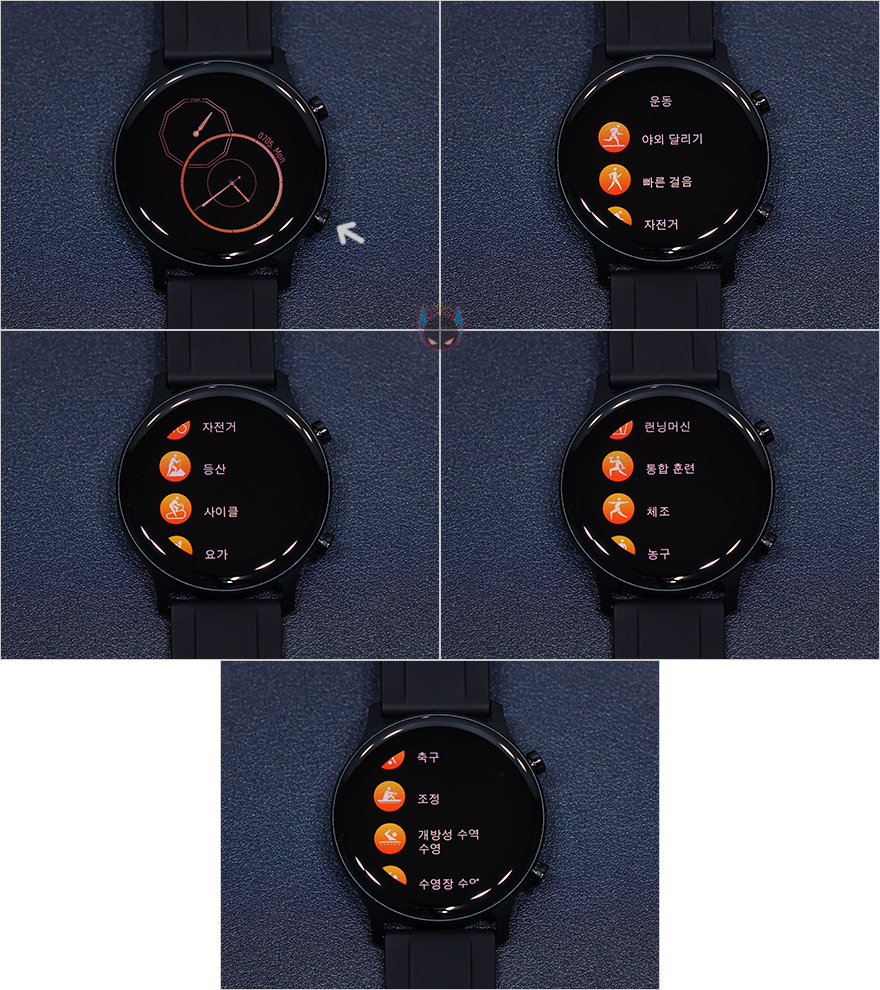 이제 메뉴에 대해서 좀 알아보면, 기본화면에서 측면 버튼 중 아래 버튼을 누르면 바로 운동모드 메뉴로 들어가는데, 야외달리기, 빠른걸음, 자전거, 등산, 사이클, 요가, 런닝머신, 통합 훈련, 체조, 농구, 축구, 조정, 개방성 수역 수영, 수영장 수영까지 총 14가지 모드를 지원하고 있습니다. 개방성 수역 수영이란 바다 같은 야외 수영을 말합니다.